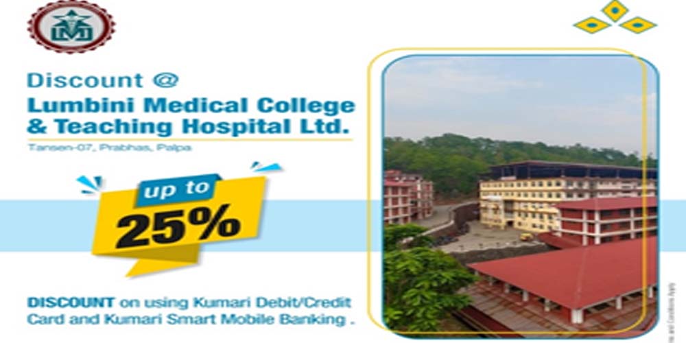 काठमाडौं । कुमारी बैंक लिमिटेड र लुम्बिनी मेडिकल कलेज एण्ड टिचिङ हस्पिटल लिमिटेड, पाल्पाबिच छुट प्रदान गर्नेसम्बन्धि सम्झौता भएको छ ।
