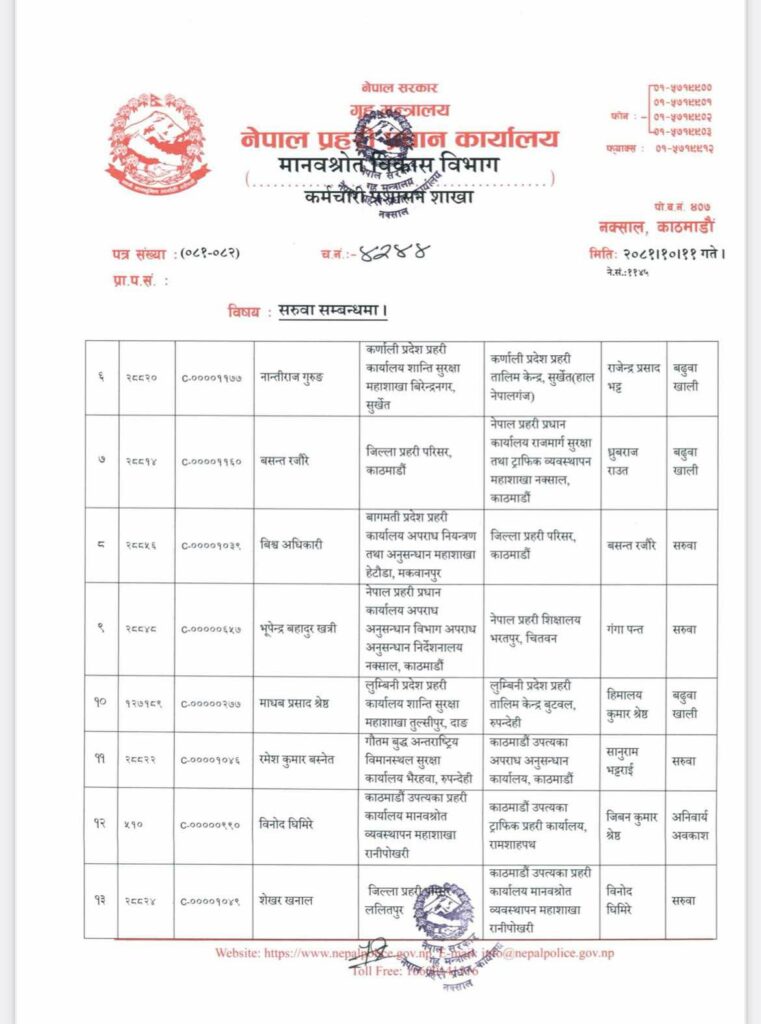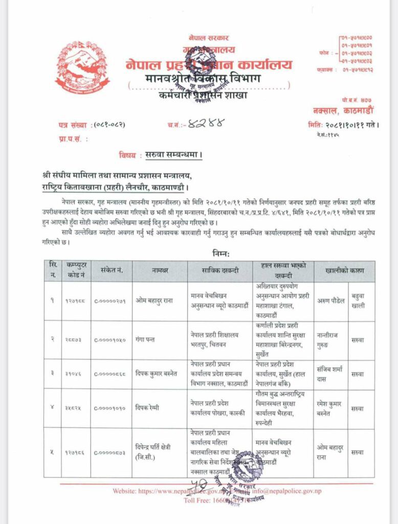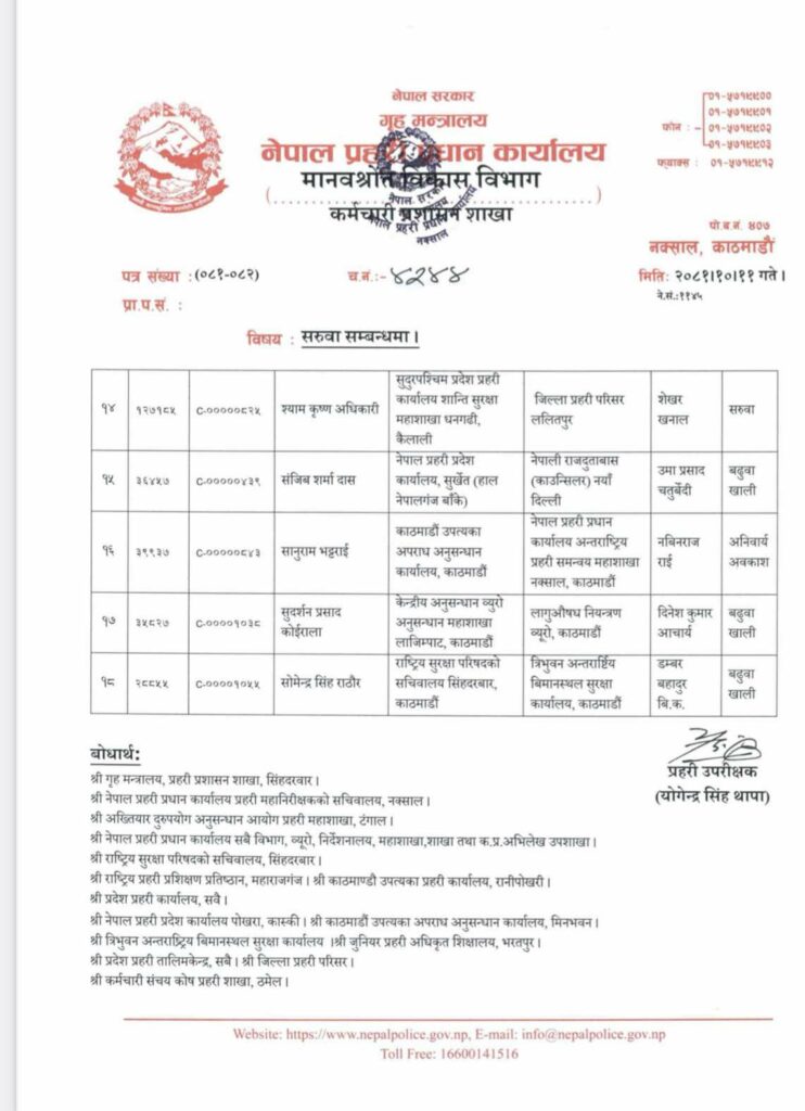 उपत्यका अपराध अनुसन्धान कार्यालय, टेकुको प्रमुखमा रमेश बस्नेत सरुवा भएका छन् । काठमाडौं प्रहरी प्रमुखको जिम्मेवारीमा रहेका बसन्त रजौरे प्रहरी प्रधान कार्यालयको राजमार्ग सुरक्षा तथा ट्राफिक व्यवस्थापन महाशाखामा सरुवा भएका छन् भने अनुसन्धान कार्यालयका प्रमुख सानुराम भट्टराई अन्तर्राष्ट्रिय प्रहरी समन्वय महाशाखामा पठाइएका छन् ।
