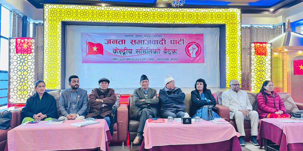 काठमाडौं । अशोक राई नेतृत्वको जनता समाजवादी पार्टी (जसपा) को केन्द्रीय समिति बैठक सुरु भएको छ । पर्साको वीरगञ्जस्थित पुजन होटलमा आज सुरु भएको बैठक भोलिसम्म चल्ने छ ।