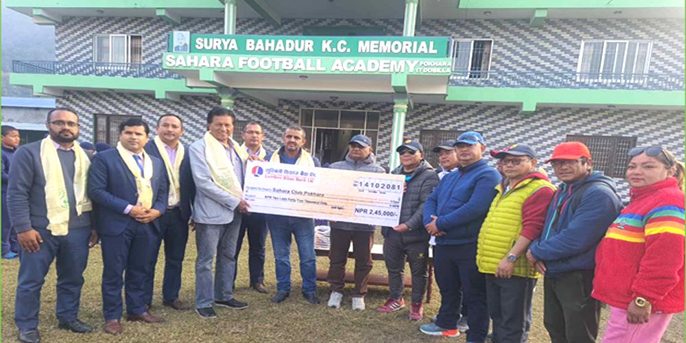 काठमाडौं । लुम्बिनी विकास बैंक लिले आफ्नो संस्थागत सामाजिक उत्तरदायित्व कार्यक्रमअन्तर्गत विगत लामो समयदेखि आर्थिक सहयोग उपलब्ध गराउँदै आएको पोखरा–१७ दोबिल्लामा सञ्चालित साहारा फुटबल एकेडेमीलाई यसपटक पनि सहयोगलाई निरन्तरता दिँदै एकेडेमीमा आश्रित विद्यार्थीको समुन्नतिका लागि आर्थिक सहयोग स्वरुप रु २ लाख ४५ हजार सहयोग हस्तान्तरण गरेको छ ।