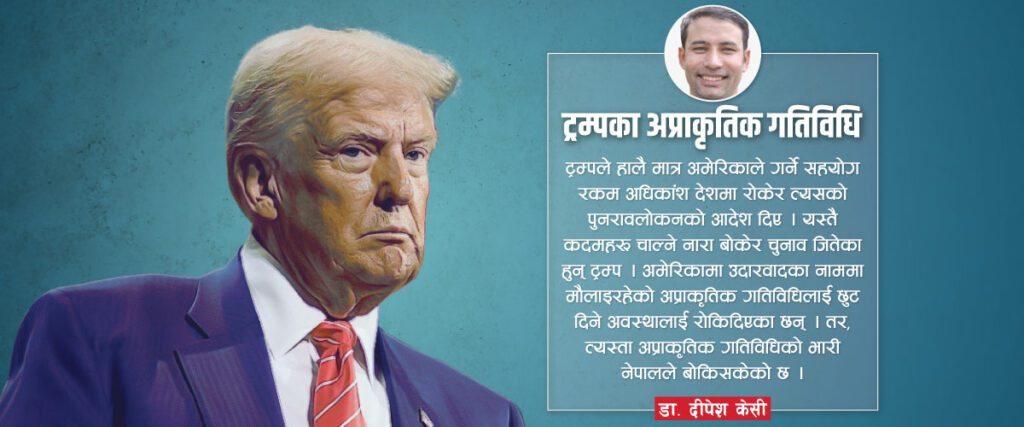 ट्रम्पले हालै मात्र अमेरिकाले गर्ने सहयोग रकम अधिकांश देशमा रोकेर त्यसको पुनरावलोकनको आदेश दिए । यस्तै कदमहरू चाल्ने नारा बोकेर चुनाव जितेका हुन् ट्रम्प । अमेरिकामा उदारवादका नाममा मौलाइरहेको अप्राकृतिक गतिविधिलाई छुट दिने अवस्थालाई रोकिदिएका छन् । तर, त्यस्ता अप्राकृतिक गतिविधिको भारी नेपालले बोकिसकेको छ ।