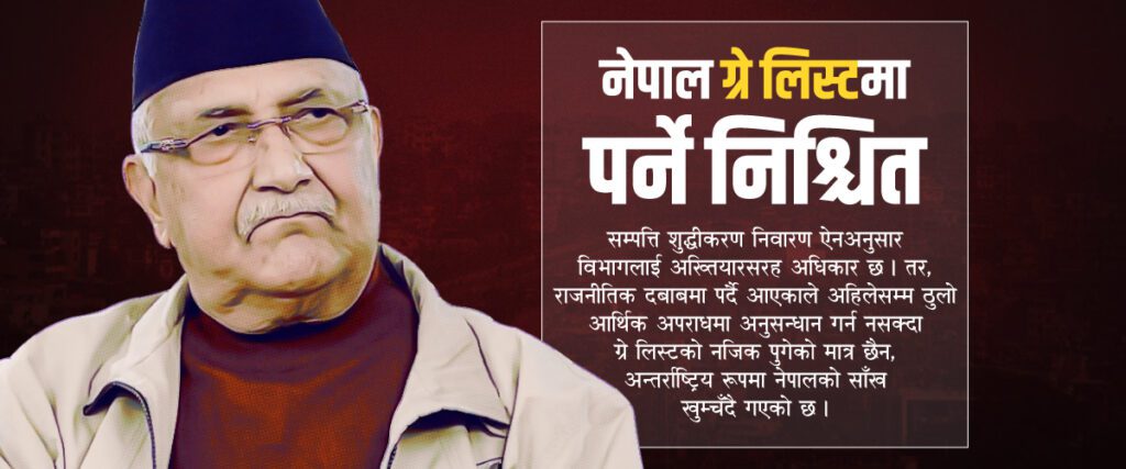 काठमाडौं । प्रधानमन्त्री केपी शर्मा ओलीले सम्पत्ति शुद्धीकरण विभाग प्रधानमन्त्री कार्यालय मातहत ल्याएपनि त्यसले परिणाममुखी काम गर्न नसकेको कारण नेपाल ‘ग्रे लिष्ट’मा पर्ने भएको छ ।