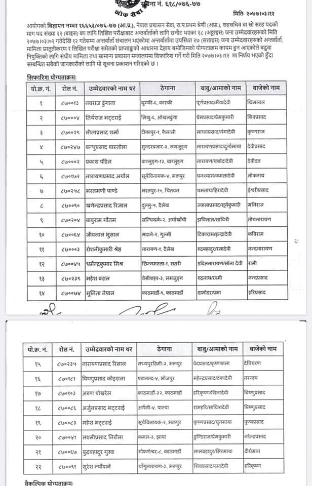 निजामती सेवाको प्रशासनतर्फका २२ उपसचिव सहसचिव बढुवामा सिफारिस भएका छन् । खुलातर्फको अन्तर्वाताको परीक्षाको लोक सेवा आयोगले शुक्रबार प्रकाशित गरेको हो ।