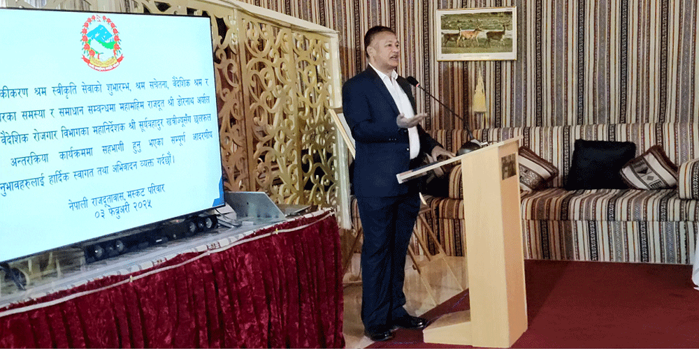 विभिन्न माध्यमबाट ओमान पुगेका तर श्रम स्वीकृति नभएका नेपालीलाईराजदूत डोरनाथ अर्याल र वैदेशिक रोजगार विभागका महानिर्देशक सूर्यबहादुर खत्रीले संयुक्त रुपमा श्रम स्वीकृति प्रदान गर्नुभएको हो ।