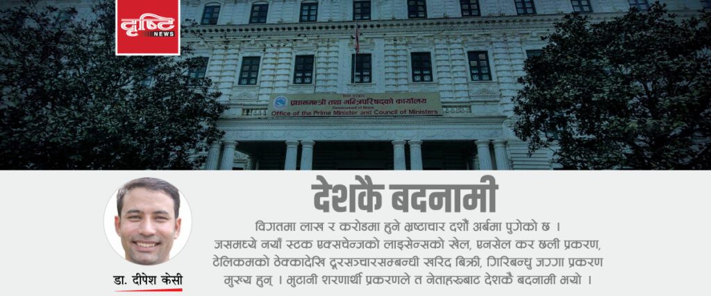 भ्रष्टाचारको दलदलमा मुलुक जाक्किदै गएको छ । बजारमा लगानीकर्ता धन खोज्छन् तर धन भ्रष्टाचारको नयाँ तौरतरिकाले विदेशिएको छ या निष्क्रिय बसेको छ । केही व्यक्तिहरूको सम्पत्ति अस्वाभाविक रूपमा बढेको छ । राज्यशक्तिको दोहन गरी भ्रष्टाचारवापत् अकूत सम्पत्ति कमाउनेको रजगुणका कारण समाजमा विकृति विसंगति मौलाएको छ ।