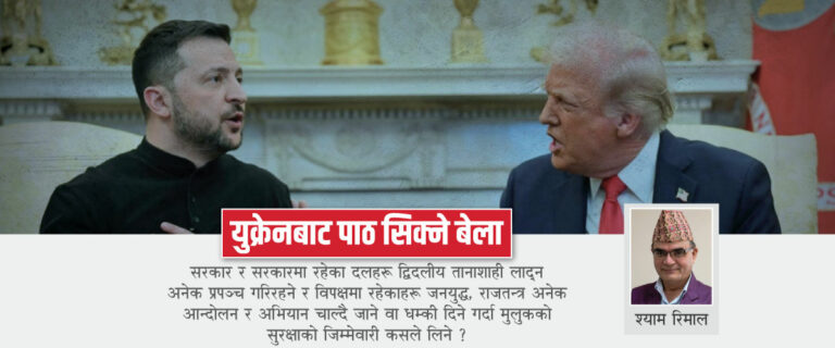 विश्व महाशक्ति संयुक्त राज्य अमेरिकालगायत नेटो र उसका सहयोगी युरोपेली राष्ट्रहरूको सहयोग पाएर अर्को महाशक्ति पूर्वसोभियत सङ्घसँग तिन वर्षदेखि लडाइँ थेगिरहेको पूर्वयुरोपेली देश युक्रेन आफ्नो देशका खनिज, तेल र प्राकृतिक ग्यास बुझाउन आउँदा पनि यसरी लुत्रे कान लगाएर फर्कनुपर्ने स्थिति साना देशका लागि सुखद त होइन नै, अर्काको बुई चढेर सधैँभर युद्धमा टिकिरहने सपना देख्नु पनि शोभनीय होइन । यसरी विश्व राजनीति अहिले झन् रोचक भएर आइरहेको छ र नेपाली पत्रकार, बुद्धिजीवी, राजनीतिज्ञ, कूटनीतिज्ञको ध्यान उतैतिरै तानिएको अवस्था छ ।