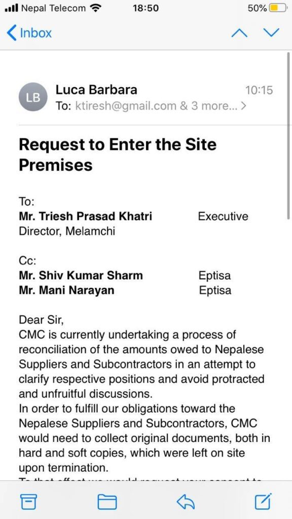 सीएमसीले हालै आयोजना प्रमुख खत्रीलाई इमेल लेख्दै नेपाली आपूर्तिकर्ताहरुको लगत विवरण संकलन भइरहेको र उक्त रकम ऊ आपैmले तिर्ने जानकारी दियो । त्यसको बोधार्थ परामर्शदाताका इप्टिसाका शिवकुमार शर्मा (सिंचाई विभागका पूर्व महानिर्देशक) र मणि नारायणलाई पनि दिइएको छ । तीन वर्षदेखि नेपाली आपूर्तिकर्ताको भुक्तानी दिनेबारे कुनै चासो नै नराखेको सीएमसीले एकाएक हामी आपैm तिर्छाैं किन भन्यो ? यसको जवाफ प्रस्ट छ– भोलि अन्तर्राष्ट्रिय अदालतबाट नेपाल सरकारलाई मुद्दा हराई आठ अर्ब रुपैयाँ लिने र नेपालीलाई आपूर्तिकर्तालाई दिँदै नदिने । यसैका लागि सचिव बेलबासे, खत्री र मन्त्री मगरसित सीएमसीको सेटिङ भएको हो ।
