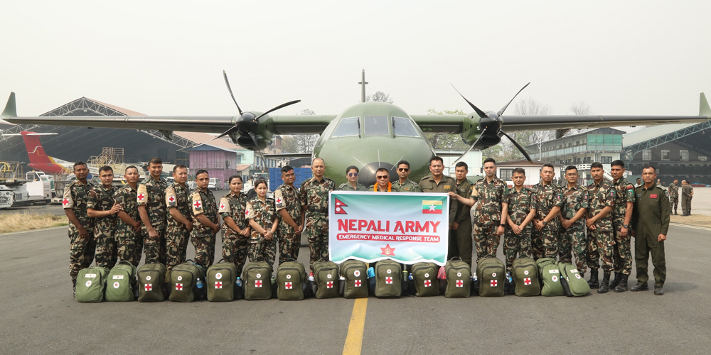 प्रमुख सेनानी रामचन्द्र श्रेष्ठको नेतृत्वमा १२ जना चिकित्सकीय टिम, चार जना बन्दोबस्ती सहायता टिम र ६ जना क्रु मेम्बरसहित २२ जनाको टोली सेनाको सीएन–२३५ सीएएसए विमानमार्फत म्यानमार गएको नेपाली सेनाले जनाएको छ ।