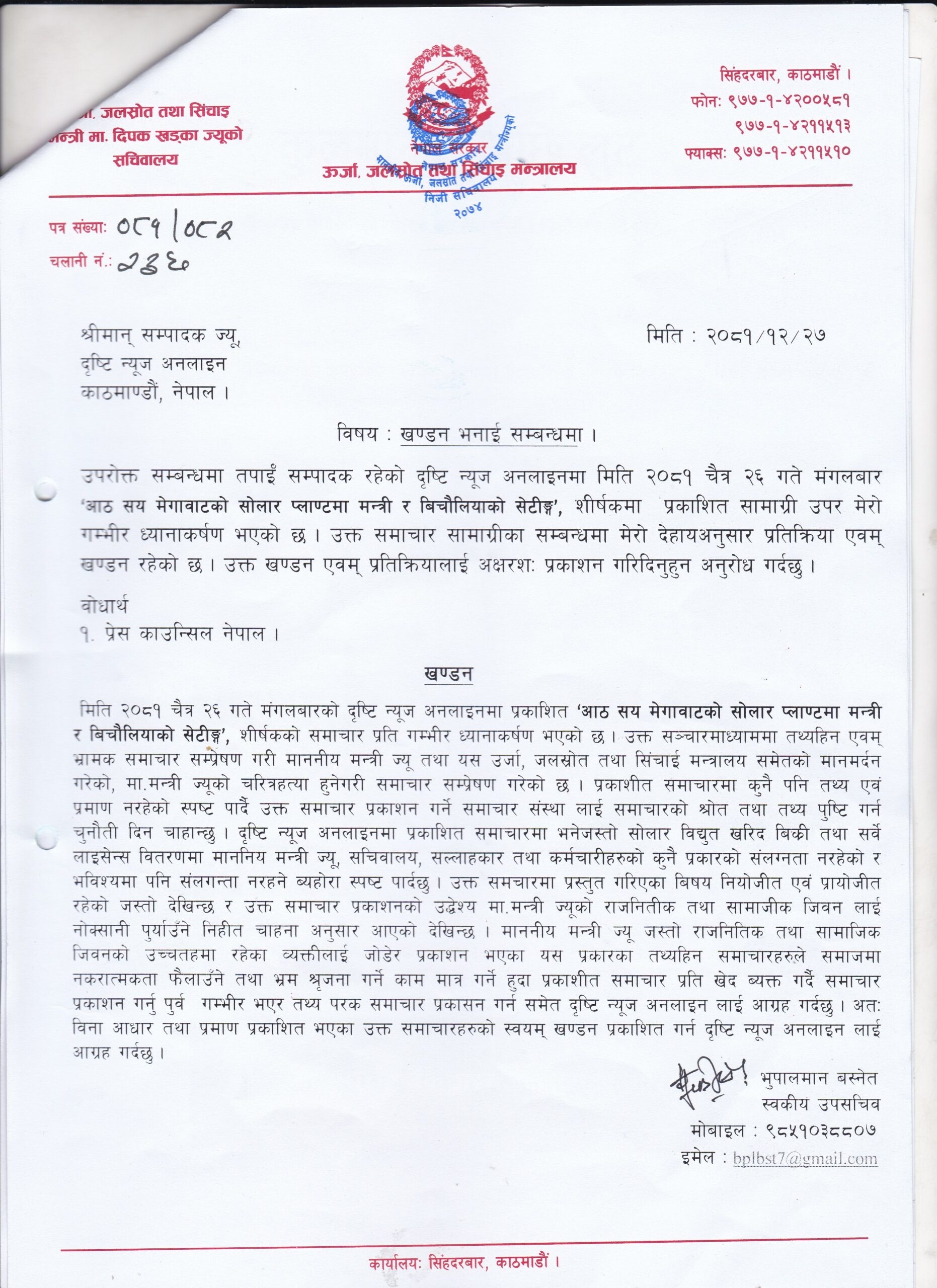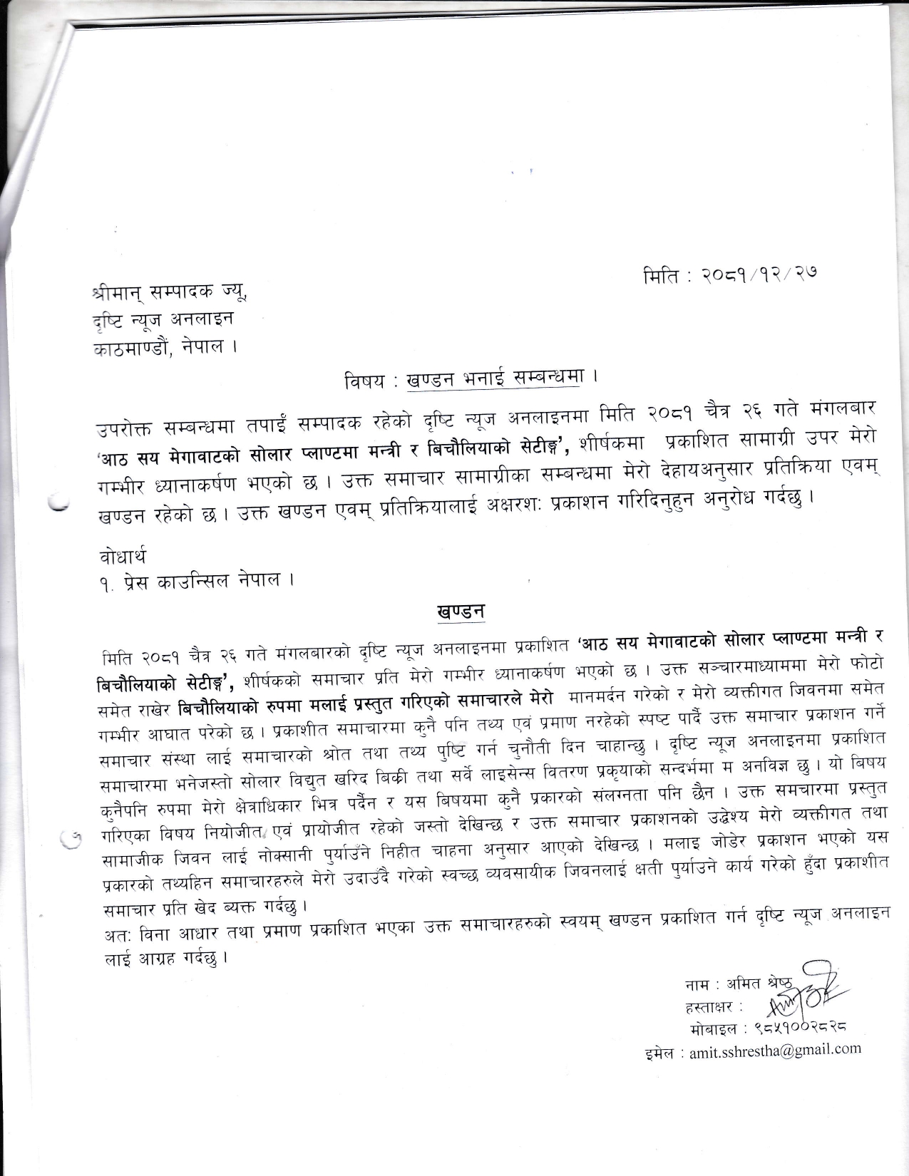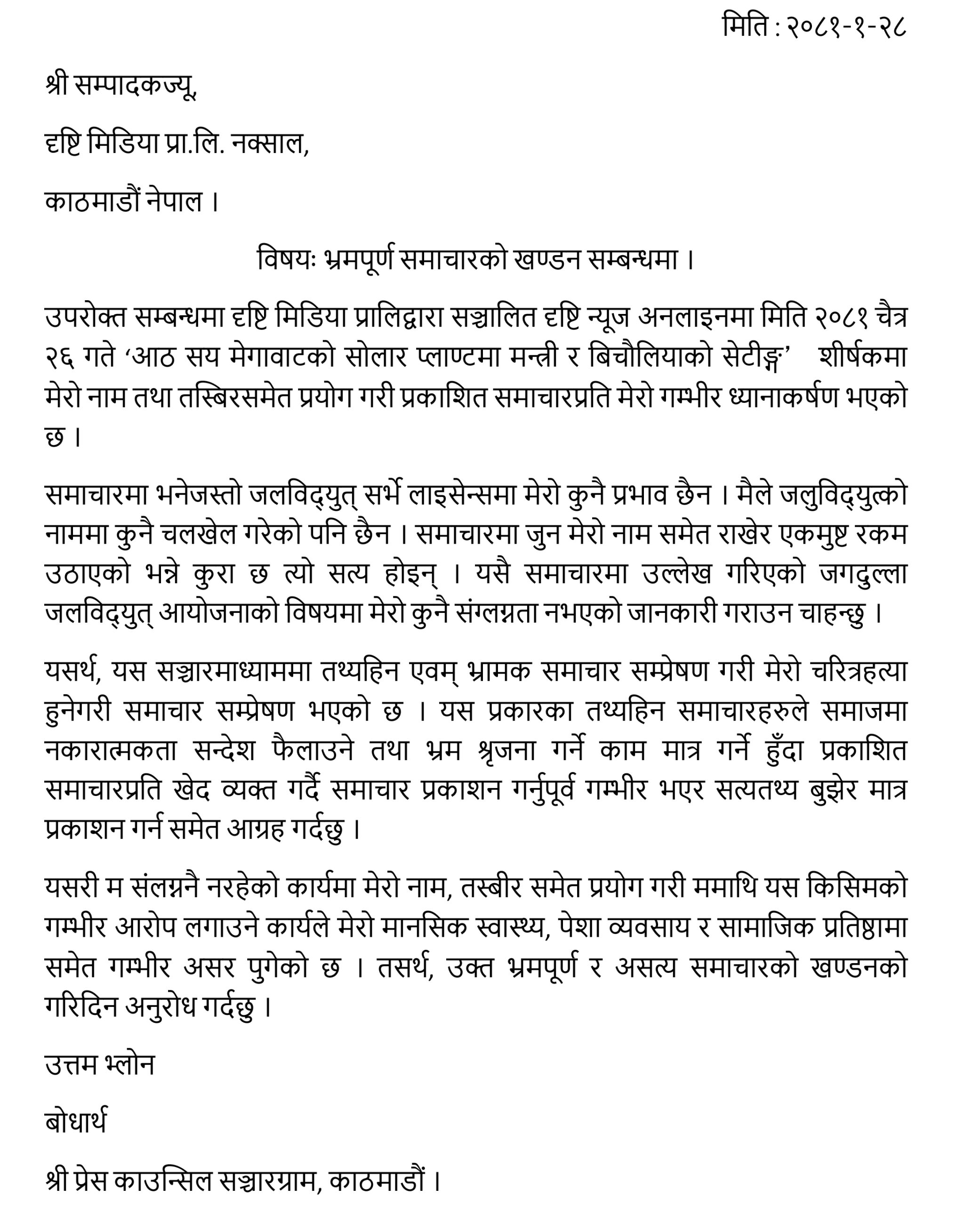 उपरोक्त सम्बन्धमा तहाँ दृष्टि मिडिया प्रालिद्वारा आज मिति २०८१/१२/ २६ मा दृष्टिन्युजमा प्रकाशित ‘कुलमान हटेपछि : आठ सय मेगावाटको सोलार प्लान्टमा मन्त्री र बिचौलियाको सेटिङ’ शीर्षक समाचारमा मेरो नाम तथा तस्बिरसमेत प्रयोग गरी मैले विभिन्न व्यक्तिहरुसँग मिली अन्य ऊर्जा कम्पनीसँग पीपीएको काम गर्दिछु भनी उल्लेखनीय रकम उठाएको र सो काम गर्नका लागि सार्वजनिक निकायलाई प्रभावमा समेत पारेको जस्तो बिल्कुलै तथ्यहिन, कपोकल्पित र पूर्णरुपमा मेरो मानहानी गर्ने आसयले समाचार प्रकाशित भएको हुँदा उक्त समाचारप्रति मेरो गम्भीर आपत्ति रहेको छ ।