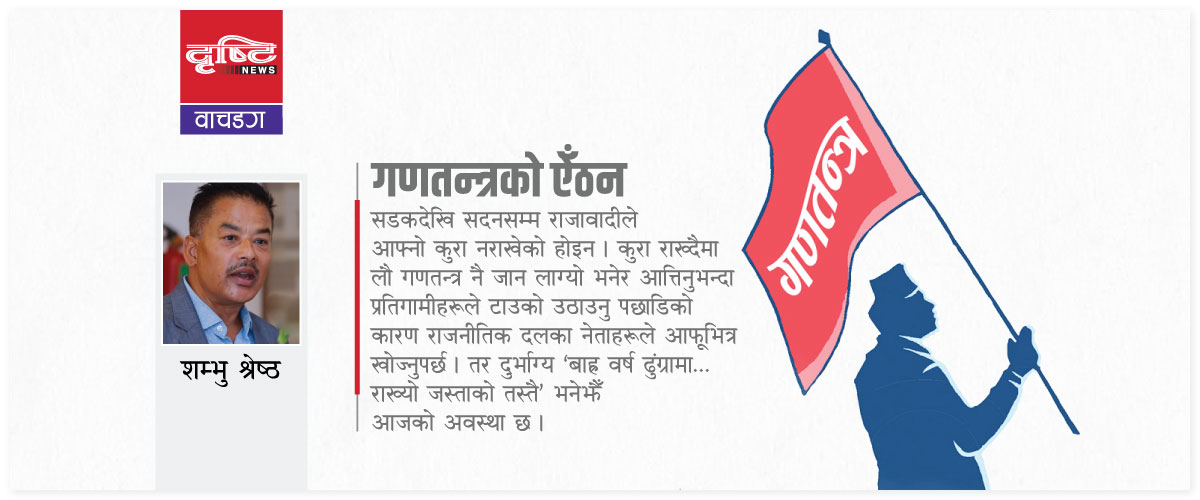 सडकदेखि सदनसम्म राजावादीले आफ्नो कुरा नराखेको होइन । कुरा राख्दैमा लौ गणतन्त्र नै जान लाग्यो भनेर आत्तिनुभन्दा प्रतिगामीहरूले टाउको उठाउनु पछाडिको कारण राजनीतिक दलका नेताहरूले आफूभित्र खोज्नुपर्छ । तर दुर्भाग्य ‘बाह्र वर्ष ढुंग्रामा… राख्यो जस्ताको तस्तै’ भनेझैँ आजको अवस्था छ ।