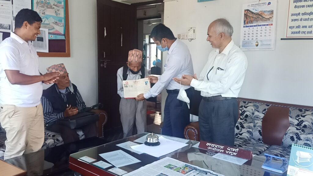 पोखरा, ३१ असार । कास्कीको मादी गाउँपालिका ९ मुग्राीवेशीका १०१ बर्षीय भूमिहीन लाभग्राही जस बहादुर थापालाई राष्ट्रिय पुनर्निर्माण प्राधिकरणले उपलब्ध गराएको २ लाख रुपैयाँबाट खरिद गरिएको जग्गाको जग्गाधनी पूर्जा प्रदान गरिएको छ । जिल्ला आयोजना कार्यान्वयन इकाई (अनुदान व्यवस्थापन तथा स्थानीय पूर्वाधार) कास्कीका प्रमुख नवराज शर्माले लाभग्राही थापालाई मंगलबार जग्गाधनी पूर्जा प्रदान गर्नुभयो ।