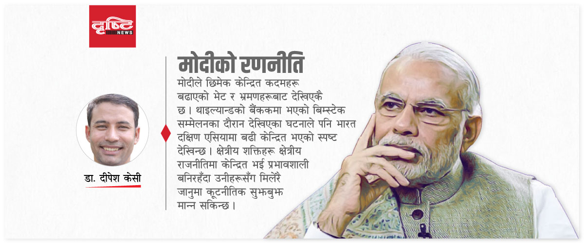थाइल्यान्डको बैंककमा भएको बिम्स्टेक सम्मेलनका दौरान देखिएका घटनाले पनि भारत दक्षिण एसियामा बढी केन्द्रित भएको स्पष्ट देखिन्छ । भारतका प्रधानमन्त्री नरेन्द्र मोदीले बिम्स्टेक देशका नेताहरूसँग महत्वका साथ साइडलाइन वार्ता गरे । जसमध्ये बंगलादेशका सरकार प्रमुख मुहम्मद युनुससँगको भेट बढी चासो बन्यो । युनुसले सेभेन सिस्टर्स भनिने उत्तरपूर्वी भारतका राज्यहरूलाई भूपरिवेष्टित भनेका थिए । उनले चीनलाई बढी तान्न खोजे बंगलादेशमा । यसबाट भारत सशंकित भइरहेको थियो । स्थिति बिगार्ने कार्य नगर्न मोदीले युनुसलाई चेतावनी नै दिएको कुरा सार्वजनिक भयो । भारतले शेख हसिनालाई शरण दिइरहेकोमा युनुसको चासो देखियो । तर, भारत हसिनालाई सुपुर्दुगी गर्ने पक्षमा त छँदैछैन बरु युनुसको विकल्पबारे विचारविमर्श चलिरहेको खबरहरू आइरहेका छन् ।