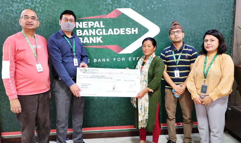 काठमाडौं । नेपाल बंगलादेश बैंक लिमिटेडले ल्याएको बचत खाता योजनाको बीमा सुविधाअन्तर्गतको बीमा रकम दाबी भुक्तानी गरेको छ । यसअन्तर्गत बैंकको धनकुटा जिल्लामा रहेको सिंधुवा शाखाका कर्मचारी बचत खातावाहक स्वर्गीय शाङ्गे शेर्पाको दुर्घटनामा परी असामयिक निधन भएकामा सो खातामा रहेको बीमा सुविधाअन्तर्गत दुर्घटना बीमावापतको प्राप्त रकम रु १५ लाख स्व शेर्पाकी पत्नी पेमलमु शेर्पालार्ई बैंकका नायब प्रमुख कार्यकारी अधिकृत सुरेन्द्रभूषण श्रेष्ठले हस्तान्तरण गर्नुभएको हो । बैंकले असार २९ गते सोमबार केन्द्रीय कार्यालय कमलादीमा एक कार्यक्रमको बीच उक्त रकम हस्तान्तरण गरेको हो ।