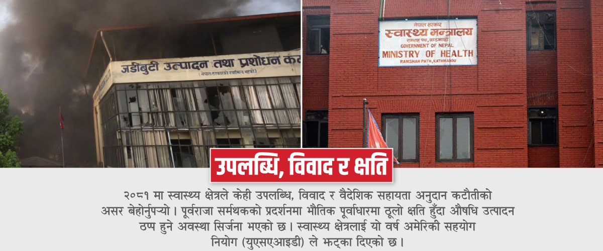पूर्वराजा सर्मथकको प्रदर्शनमा भौतिक पूर्वाधारमा ठूलो क्षति हुँदा औषधि उत्पादन ठप्प हुने अवस्था सिर्जना भएको छ । अर्कोतर्फ वैदेशिक सहायता रोकिँदा आधारभूत स्वास्थ्य सेवाबाट विकट गाउँका महिला तथा बालबालिका प्रभावित भएका छन् । यी असहजताका बीच पनि स्वास्थ्य क्षेत्रले यो वर्ष पाएका केही उपलब्धि हासिल गरेको छ ।