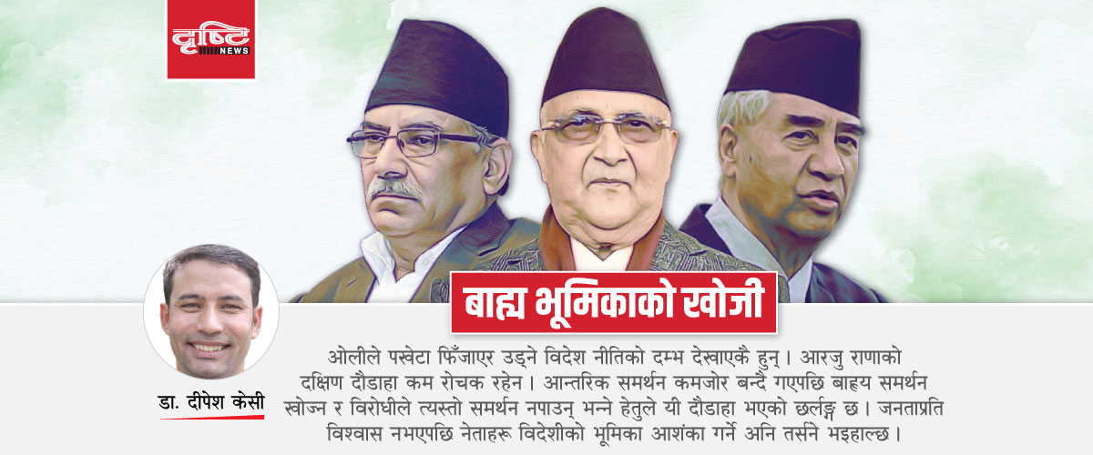 ओलीले पखेंटा फिँजाएर उड्ने विदेशनीतिको दम्भ देखाएकै हुन् । आरजु राणा देउवाको दक्षिण दौडाहा कम रोचक रहेन । आन्तरिक समर्थन कमजोर बन्दै गएपछि बाह्य समर्थन खोज्न र विरोधीले त्यस्तो समर्थन नपाउन् भन्ने हेतुले यी दौडाहा भएको छर्लङ्ग छ ।