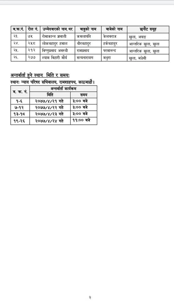 आन्तरिक खुलातर्फ १४ जना माग भएको १६ तथा खुलातर्फ ९ को माग भएकोमा २६ जनाले नाम निकालेका छन् । मधेसी कोटातर्फ १ मा २ जना तथा अपांंगतर्फ १ कोटामा एक जनाले नाम निकालेका छन् । परीक्षामा आन्तरिक खुला तथा अन्य आरक्षणमा नाम निकाल्ने सबैले खुलामा पनि नाम निकालेका छन् । लोक सेवा आयोगको समेत संलग्नतामा भएो परीक्षमा दुई सय २९ जना सहभागी भएका थिए । लिखित परीक्षामा उत्तिर्ण हुनेहरुको २१ साउनदेखि अन्तर्वाता हुने आयोगले जनाएको छ ।