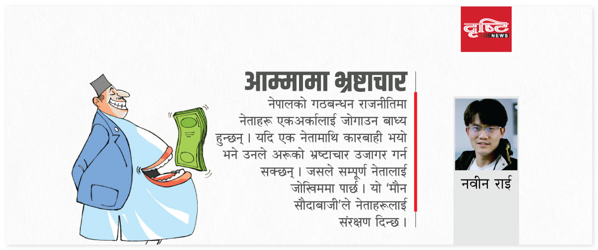 नेपालको गठबन्धन राजनीतिमा नेताहरू एकअर्कालाई जोगाउन बाध्य हुन्छन् । यदि एक नेतामाथि कारबाही भयो भने उनले अरूको भ्रष्टाचार उजागर गर्न सक्छन् । जसले सम्पूर्ण नेतालाई जोखिममा पार्छ । यो ‘मौन सौदाबाजी’ले नेताहरूलाई संरक्षण दिन्छ । एकातिर संस्थागत भ्रष्टाचार, अर्कोतिर कानुनी कमजोरी । अख्तियार, न्यायालय, र संवैधानिक निकायहरूमा हुने नियुक्ति समेत दलगत भागबन्डाले भरिएको हुँदा नागरिक निरीह बन्न बाध्य छन् ।