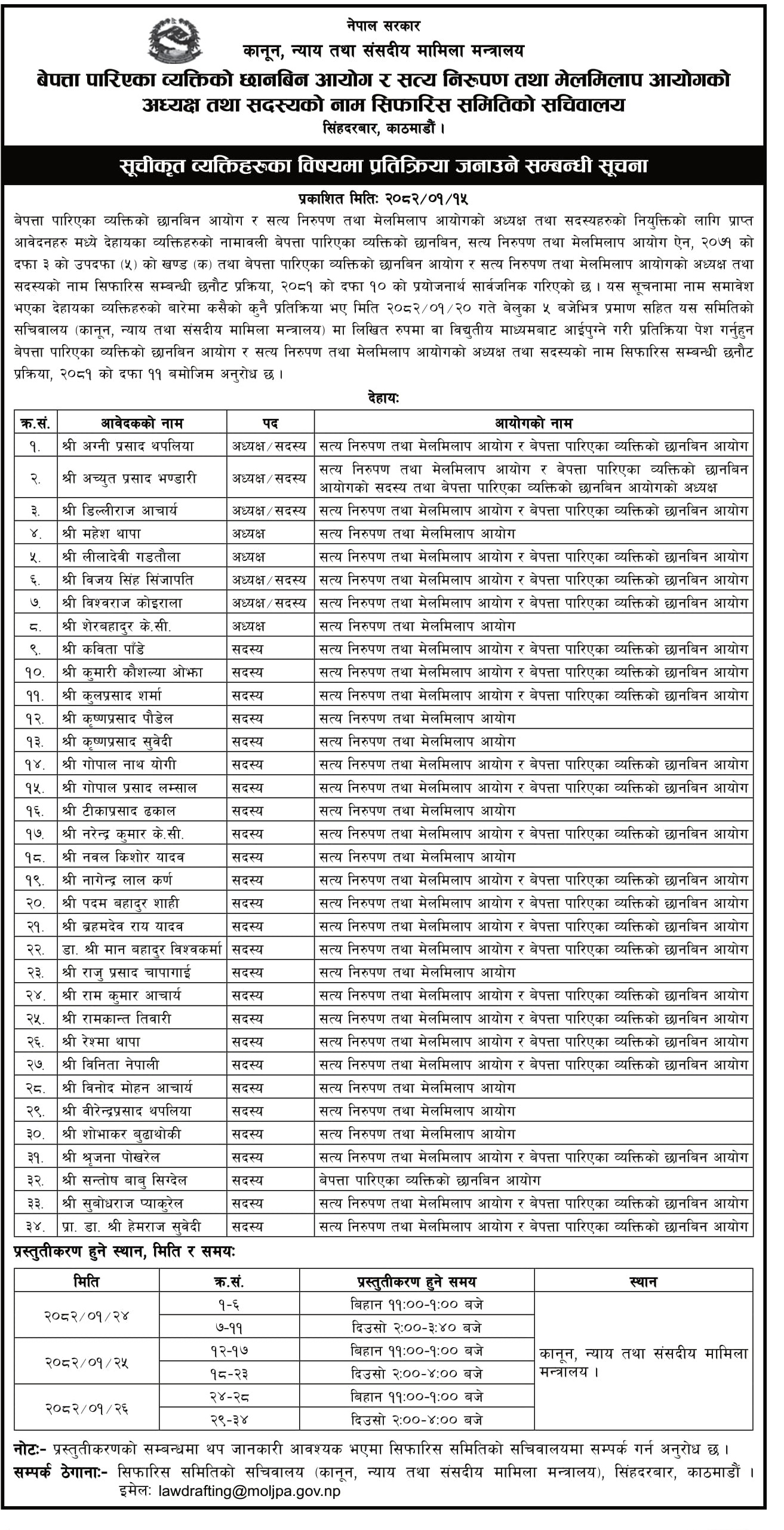 त्यस्तै क्रमसंख्या २४ देखि २८ सम्म रहेकाहरूले वैशाख २६ गते बिहान ११ बजेदेखि दिउँसो १ बजेसम्म र क्रमसंख्या २९ देखि ३४ सम्म परेकाहरूले दिउँसो २ बजेदेखि ४ बजेसम्म प्रस्तुतीकरण दिनेछन् । उजुरी र प्रस्तुतीकरणको मूल्यांकनपछि समितिले पदाधिकारी र सदस्यहरूका लागि सरकारलाई सिफारिस गर्छ ।