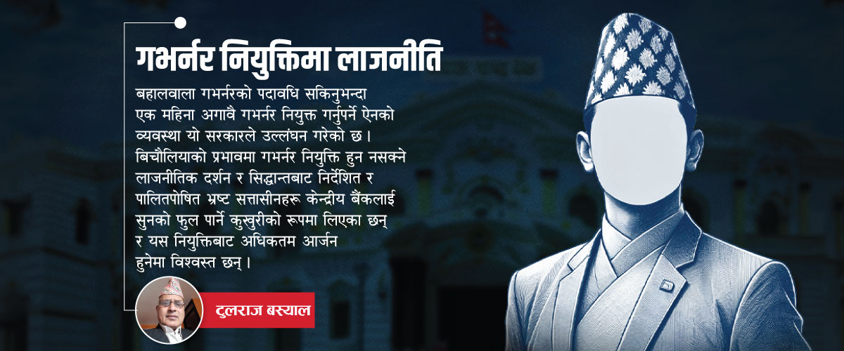 बहालवाला गभर्नरको पदावधि सकिनुभन्दा एक महिना अगावै गभर्नर नियुक्त गर्नुपर्ने ऐनको व्यवस्था यो सरकारले उल्लंघन गरेको छ । बिचौलियाको प्रभावमा गभर्नर नियुक्ति हुन नसक्ने लाजनीतिक दर्शन र सिद्धान्तबाट निर्देशित र पालितपोषित भ्रष्ट सत्तासीनहरू केन्द्रीय बैंकलाई सुनको फुल पार्ने कुखुरीको रूपमा लिएका छन् र यस नियुक्तिबाट अधिकतम आर्जन हुनेमा विश्वस्त छन् ।