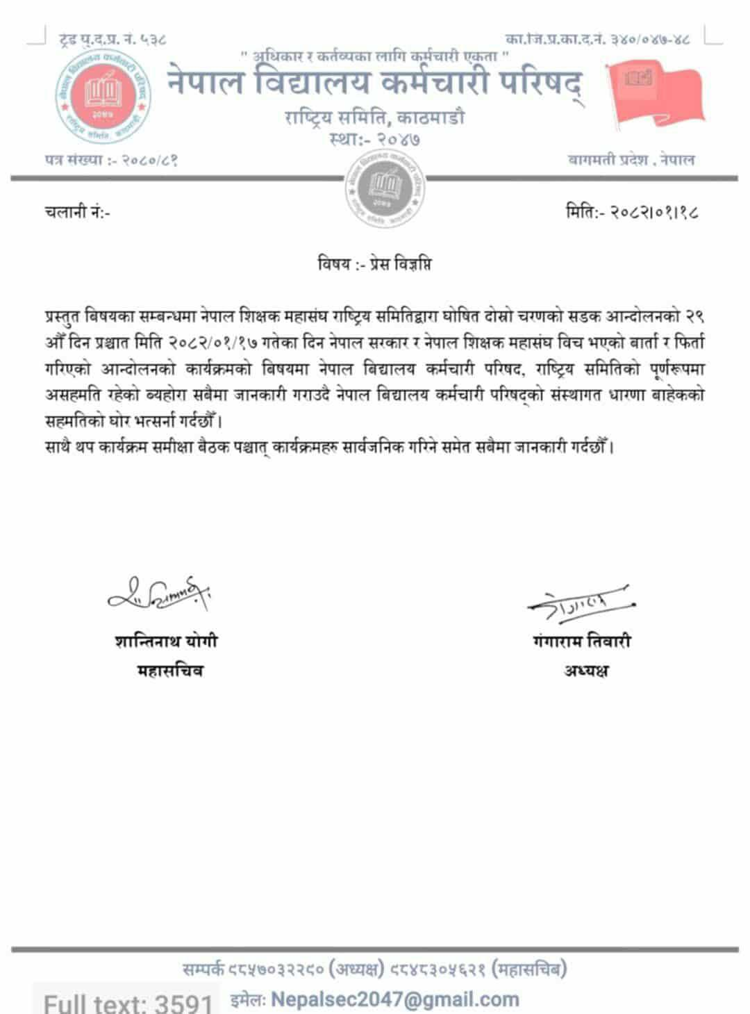 काठमाडौं । नेपाल विद्यालय कर्मचारी परिषद्ले सरकार र नेपाल शिक्षक महासंघबीच भएको सहमतिप्रति असन्तुष्टि जनाएको छ । परिषद्ले आज एक विज्ञप्ति जारी गर्दै शिक्षक महासंघले शिक्षा मन्त्रालयसँग गरेको सम्झौतामा असहमति जनाएको हो ।