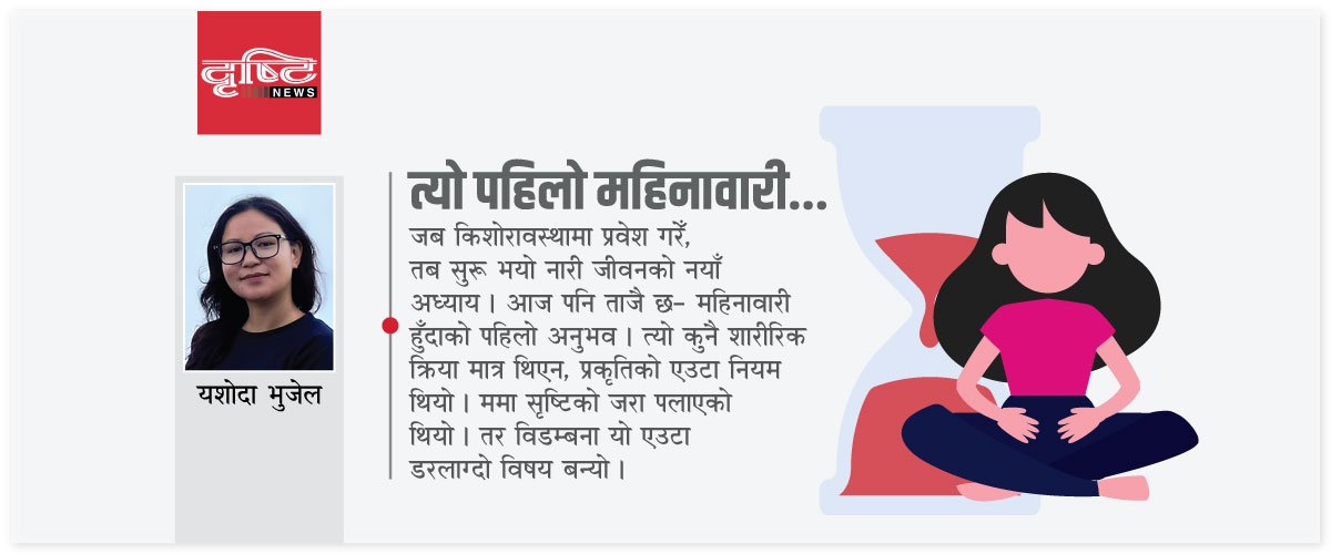 यो कुनै शारीरिक क्रिया मात्र थिएन । यो त प्रकृतिको एउटा नियम थियो । ममा सृष्टिको जरा पलाएको थियो । नारी अस्तित्वको आभास गरेकी थिएँ । तर विडम्बना यो एउटा डरलाग्दो विषय बन्यो । जब ममीले ‘यो कुरा कसैलाई नभन्नु’ भन्नुभयो ।