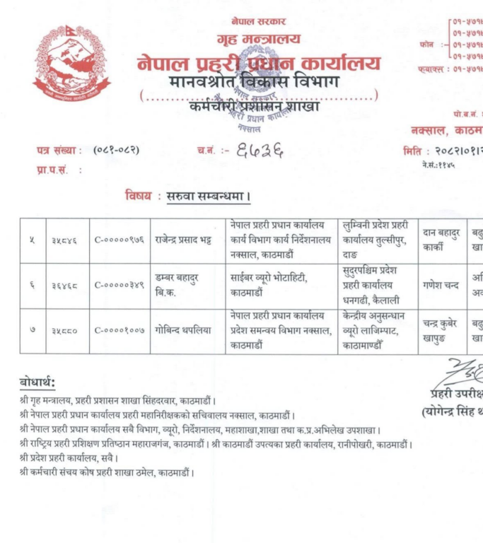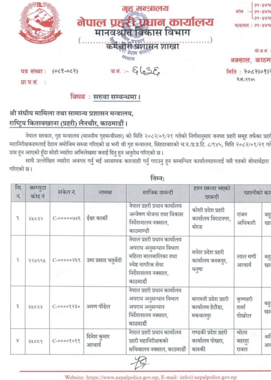 गृह मन्त्रालयको निर्णयअनुसार कोशी प्रदेशमा ईश्वर कार्की, मधेश प्रदेशमा उमा प्रसाद चतुर्वेदी, बागमती प्रदेशमा अरुण पौडेल र गण्डकी प्रदेशमा दिनेश कुमार आचार्यलाई सरुवा गरिएको छ। त्यसै गरी, लुम्बिनी प्रदेशको प्रहरी प्रमुखमा राजेन्द्र प्रसाद भट्ट नियुक्त भएका छन् ।