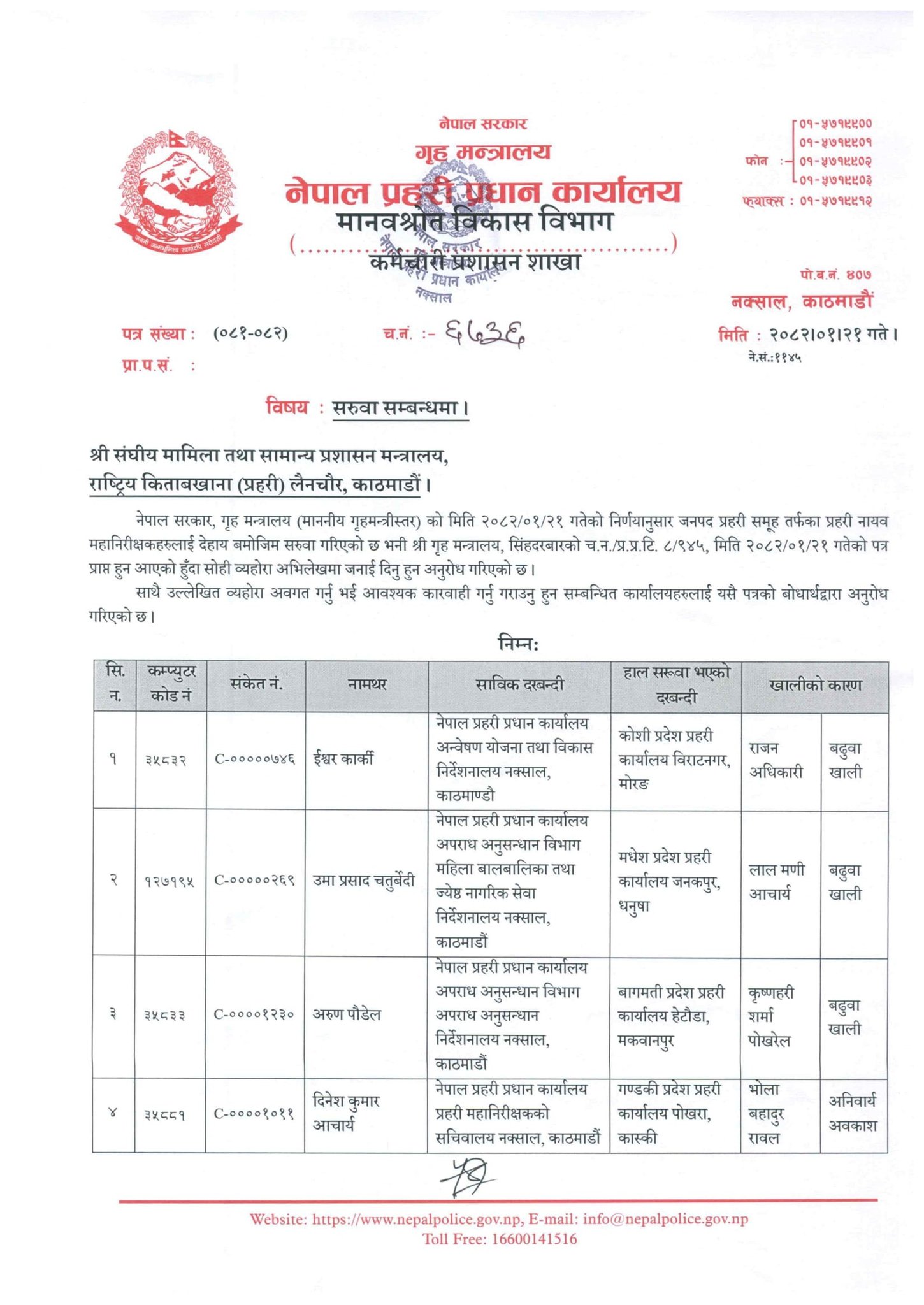 प्रहरी प्रधान कार्यालयका डीआईजी ईश्वर कार्कीलाई कोशी प्रदेश कार्यालय विराटनगर खटाइएको छ भने उमा प्रसाद चतुुर्बेदीलाई मधेश प्रदेश, बागमती प्रदेशमा अरुण पौडेल र गण्डकी प्रदेशमा दिनेशकुमार आचार्यलाई सरुवा गरिएको छ ।
