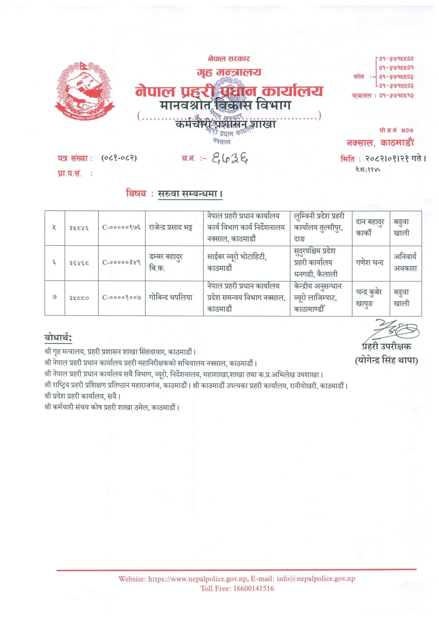 त्यस्तै, लुम्बिनीमा राजेन्द्र प्रसाद भट्ट, सुदूरपश्चिममा डम्बरबहादुर बिक र केन्द्रीय अनुसन्धान ब्यूरोमा गोबिन्द थपलियालाई सरुवा गरिएको प्रधान कार्यालयले जनाएको छ । लुम्बिनी प्रदेशमा भने अब बढुवा हुने डीआईजीबाट पठाइने भएकाले सरुवा नगरिएको बताइएको छ ।