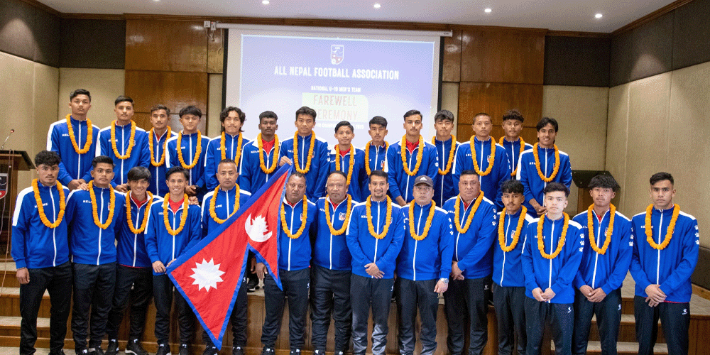 काठमाडौं । साफ यू-१९ फुटबल प्रतियोगितामा सहभागी हुन लागेको नेपाली राष्ट्रिय टोलीलाई सोमबार विशेष कार्यक्रमकाबीच बिदाइ गरिएको छ । अखिल नेपाल फुटबल संघ (एन्फा)ले सातदोबाटोस्थित एन्फा कम्प्लेक्समा टोलीलाई बिदाइ गरेको हो ।