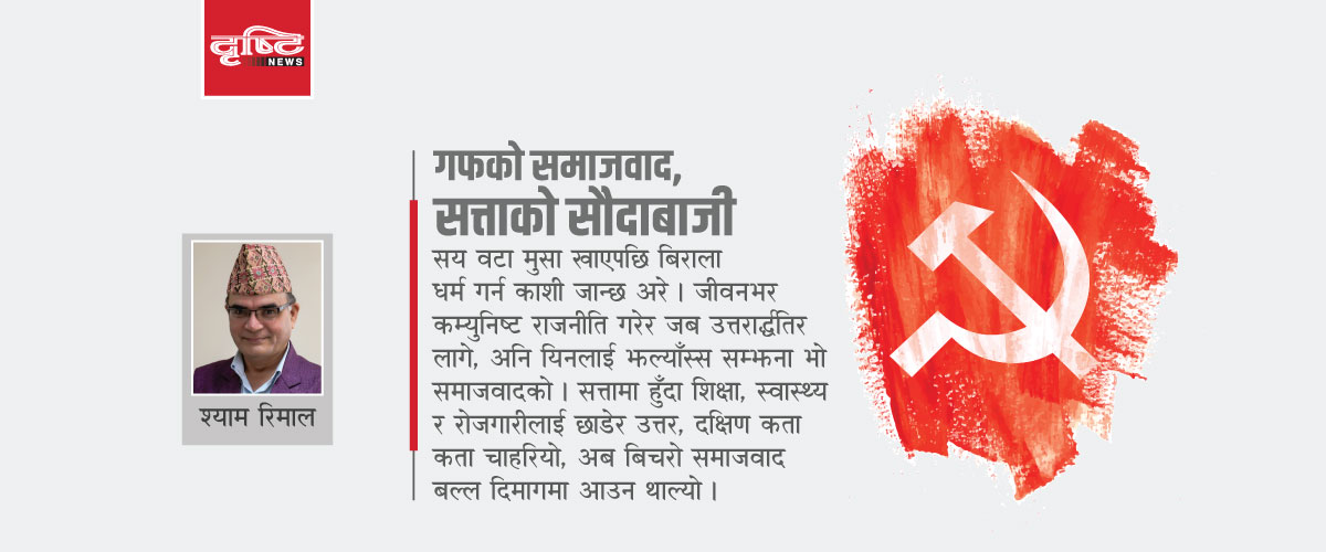 सय वटा मुसा खाएपछि बिराला धर्म गर्न काशी जान्छ अरे । जीवनभर कम्युनिस्ट राजनीति गरेर जब उत्तराद्र्धतिर लागे, अनि यिनलाई झल्याँस्स सम्झना भो समाजवादको । सत्तामा हुँदा शिक्षा, स्वास्थ्य र रोजगारीलाई छाडेर उत्तर, दक्षिण कता कता चाहरियो, अब बिचरो समाजवाद बल्ल दिमागमा आउन थाल्यो । पहिले राष्ट्रपति खान्छु भनेर चुनावमा पोस्टर बनाए, त्यो नपाएपछि प्रधानमन्त्री भए पनि खान्छु भनेर लाग्दा नेपाली सेनाका प्रधानसेनापति, पशुपतिका मूलभट्ट आदि अनेक भाउँतो लागेर सत्ता छाड्नु प¥यो ।