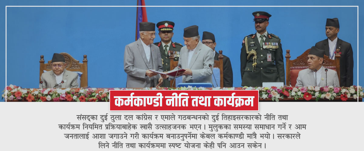 संसद्का दुई ठुला दल कांग्रेस र एमाले गठबन्धनको दुई तिहाइ सरकारको नीति तथा कार्यक्रम नियमित प्रक्रियाबाहेक खासै उत्साहजनक भएन । मुलुकका समस्या समाधान गर्ने र आम जनतालाई आशा जगाउने गरी कार्यक्रम बनाउनुपर्नेमा केबल कर्मकाण्डी मात्रै भयो ।