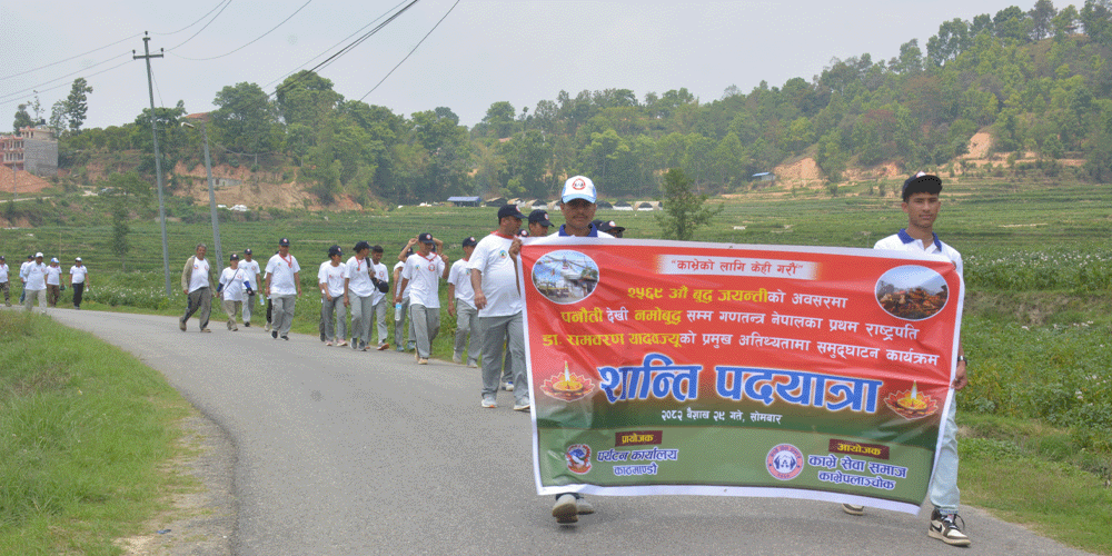 धुलिखेल । दुई हजार ५६९औँ बुद्धजयन्तीको अवसरमा आज काभ्रेपलाञ्चोकको पनौतीदेखि नमोबुद्ध स्तूपासम्मको शान्ति पदयात्रा गरिएको छ । ‘काभ्रेपलाञ्चोकका लागि केही गरौँ’ भन्ने नाराका काभ्रे सेवा समाजको आयोजनामा भएको शान्ति पदयात्राको पूर्वराष्ट्रपति डा रामवरण यादवले पनौतीस्थित राजकुमार महासत्त्वको पूर्व जन्मघर रहेको पनौतीमा उद्घाटन गरेका हुन् ।