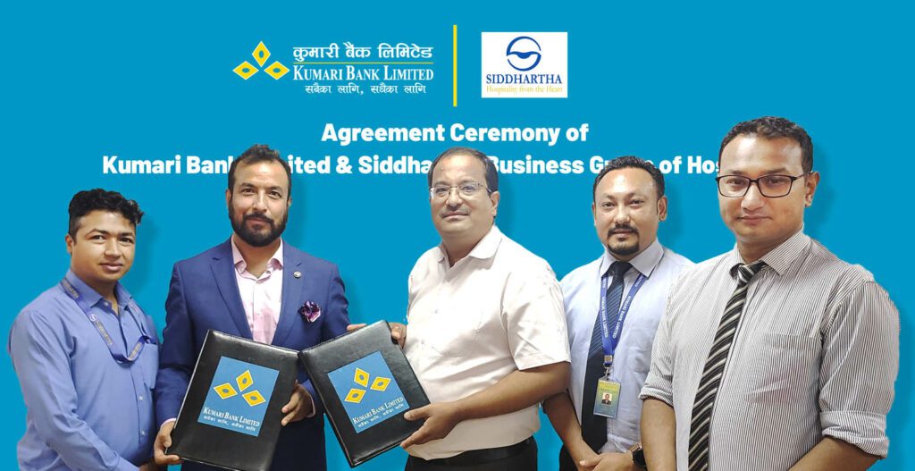 काठमाडौं । कुमारी बैंक लिमिटेड र सिद्धार्थ बिजनेस ग्रुप अफ हस्पिटालिटीका बीच विशेष सेवाहरुमा छुटको प्रावधान सम्बन्धी सम्झौता भएको छ ।