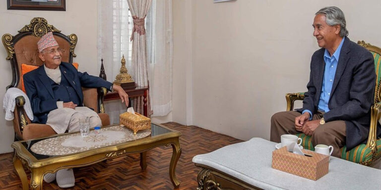 काठमाडौं । प्रधानमन्त्री केपी शर्मा ओली र नेपाली कांग्रेसका सभापति शेरबहादुर देउवाबीच भेटवार्ता भएको छ । उनीहरुबीच प्रधानमन्त्रीको सरकारी निवास बालुवाटारमा आज भेट भएको हो ।