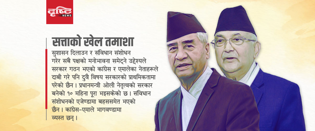 काठमाडौं । सुशासन दिलाउन र संविधान संशोधन गरेर सबै पक्षको मनोभावना समेट्ने उद्देश्यले सरकार गठन भएको कांग्रेस र एमालेका नेताहरूले दाबी गरे पनि दुवै विषय सरकारको प्राथमिकतामा परेको छैन ।