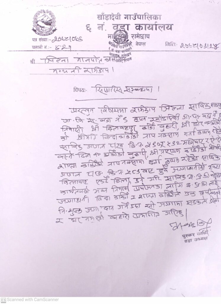 काठमाडौँ, १६ साउन । रामेछापको खाँडादेवी गाँउपालिकाले जुन प्रयोजनमा जग्गा लिएको हो सोहीअनुसार काम नगरेको भन्दै जग्गादाता तथा स्थानीयवासीहरुले जग्गा लिँदाको प्रयोजनअनुसार काम गरिनुपर्ने माग राखेका छन् ।