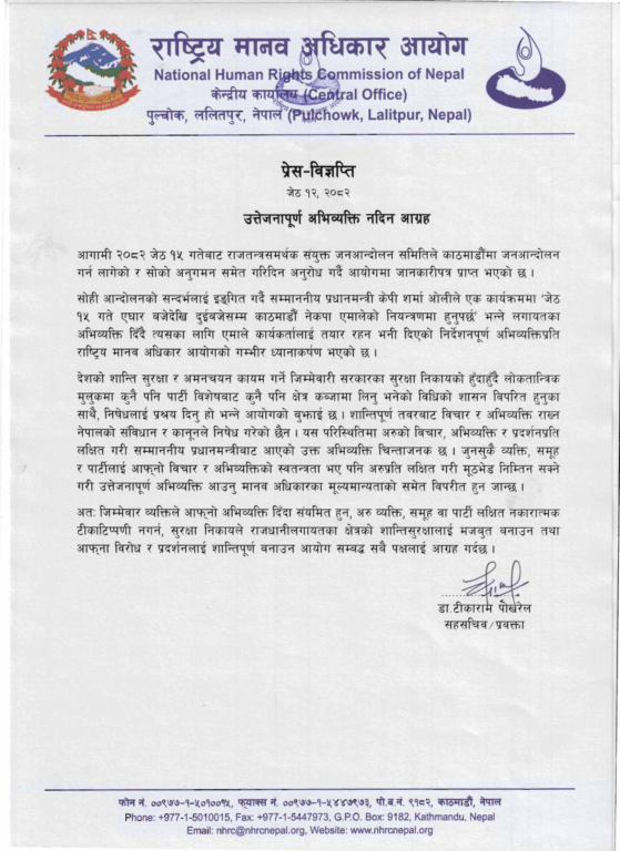 आयोगले नेपालको संविधान र कानुनले शान्तिपूर्ण रूपमा विचार र अभिव्यक्ति राख्न कुनै निषेध नगरेको स्मरण गराउँदै जिम्मेवार व्यक्तिहरूलाई संयमित अभिव्यक्ति दिन, अरू व्यक्ति, समूह वा पार्टीलाई लक्षित गरी मुठभेड निम्त्याउन सक्ने उत्तेजनापूर्ण टिप्पणी नगर्न र शान्तिपूर्ण प्रदर्शन सुनिश्चित गर्न आग्रह गरेको छ । साथै, सुरक्षा निकायलाई राजधानीलगायतका क्षेत्रमा शान्ति–सुरक्षा मजबुत बनाउन निर्देशन दिएको छ ।