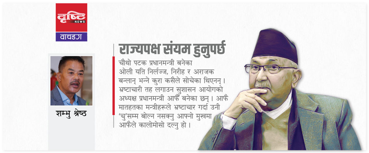 चौथो पटक प्रधानमन्त्री बनेका केपी शर्मा ओली यति निर्लज्ज, निरीह र अराजक बन्लान् भन्ने कुरा कसैले सोचेका थिएनन् । दोस्रो पटक नेपाली कांग्रेसको समर्थनमा दुई तिहाइको प्रधानमन्त्री बनेका ओलीबाट धेरैले सुशासनको अपेक्षा गरेका थिए । उनी आफैँले बेलाबेलामा ‘भ्रष्टाचारीको मुखै हेर्दिनँ, भ्रष्टाचारीलाई ठाउँको ठाउँ ऐयाँ, आच्छु पनि भन्न नपाउँदै कारबाही गर्छु’ भन्दै आएका थिए । प्रधानमन्त्रीको मुखबाट यस्तो शब्द निस्किएपछि पत्याउँदै प¥यो ।