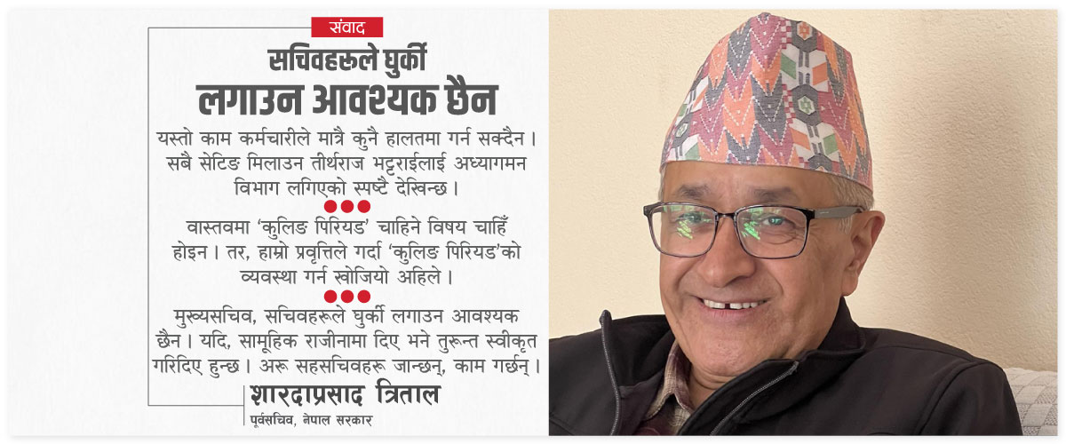 अर्कोतर्फ, ‘कुलिङ पिरियड’लाई लिएर मुख्यसचिव–सचिवहरू हुल बाँधेर प्रधानमन्त्री र सत्तारुढ दलका नेतालाई दबाब दिन हिँडेको दृष्यले जग सहाएको छ । ‘कुलिङ पिरियड’ कायम भयो भने राजनीतिक नियुक्ति खान पाइँदैन भन्ने चिन्ता उनीहरूलाई छ । सेटिङमा काम भएपछि नीतिगत भ्रष्टाचार बढेको बढ्यै छ । त्रिविको जग्गासमेत व्यापक दुरुपयोग भएको छ । यिनै विषयमा नेपाल सरकारका पूर्वसचिव शारदाप्रसाद त्रितालसँग दृष्टिले गरेको कुराकानीको सम्पादित अंश :