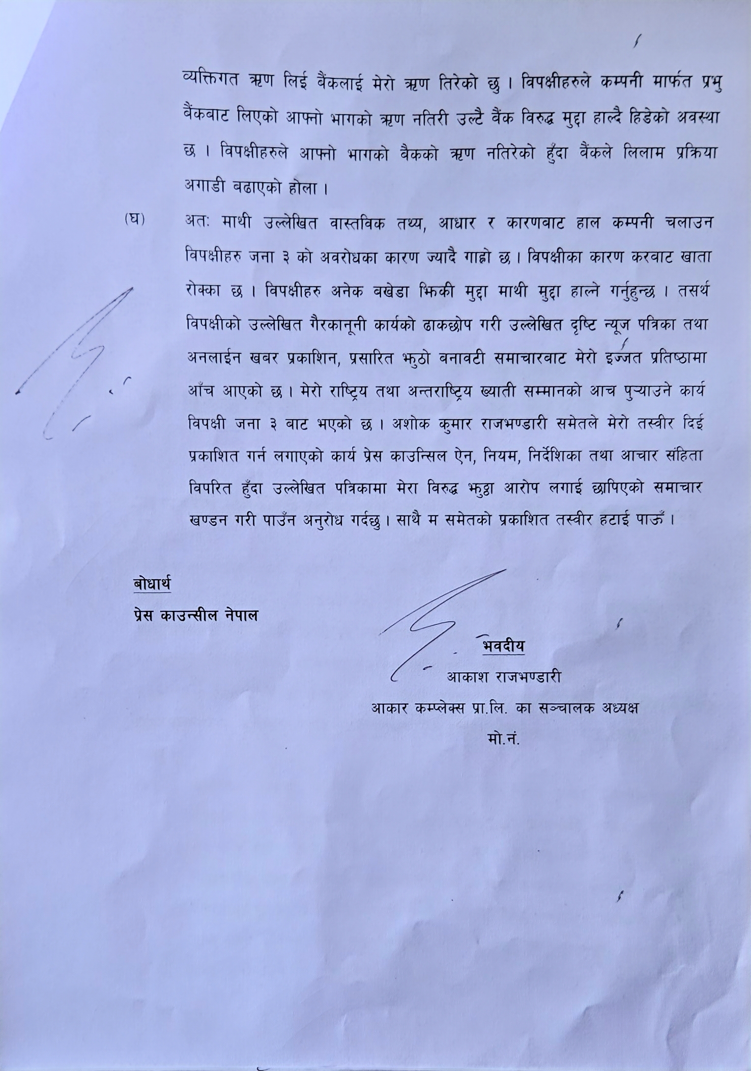 यस्तै, माथि प्रकाशित सामग्रीउपर आकाश राजभण्डारीले पनि असहमति जनाउँदै सम्प्रेषित समाचारको खण्डन गरेका छन् । आकाश राजभण्डारीले आफ्नो खण्डन पत्रमा भनेका छन्, ‘माथि उल्लेखित बनावटी समाचारबाट मेरो इज्वत र प्रतिष्ठामा आँच आएको छ । म विरुद्ध लगाइएको आरोप तथ्यहिन छ । म विरुद्ध झुटा आरोप लगाई छापिएको समाचार खण्डन गरी पाउन अनुरोध गर्दछु ।