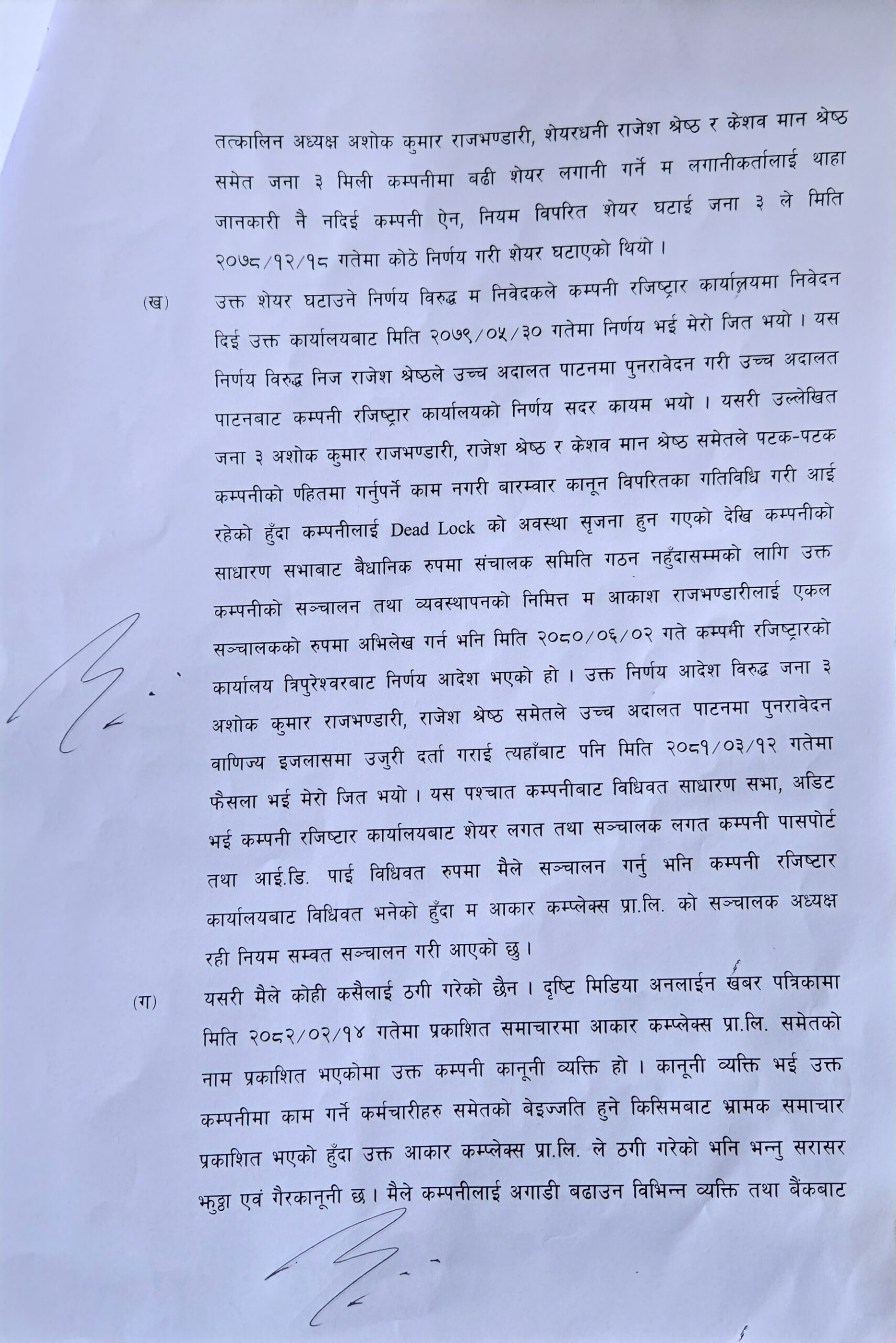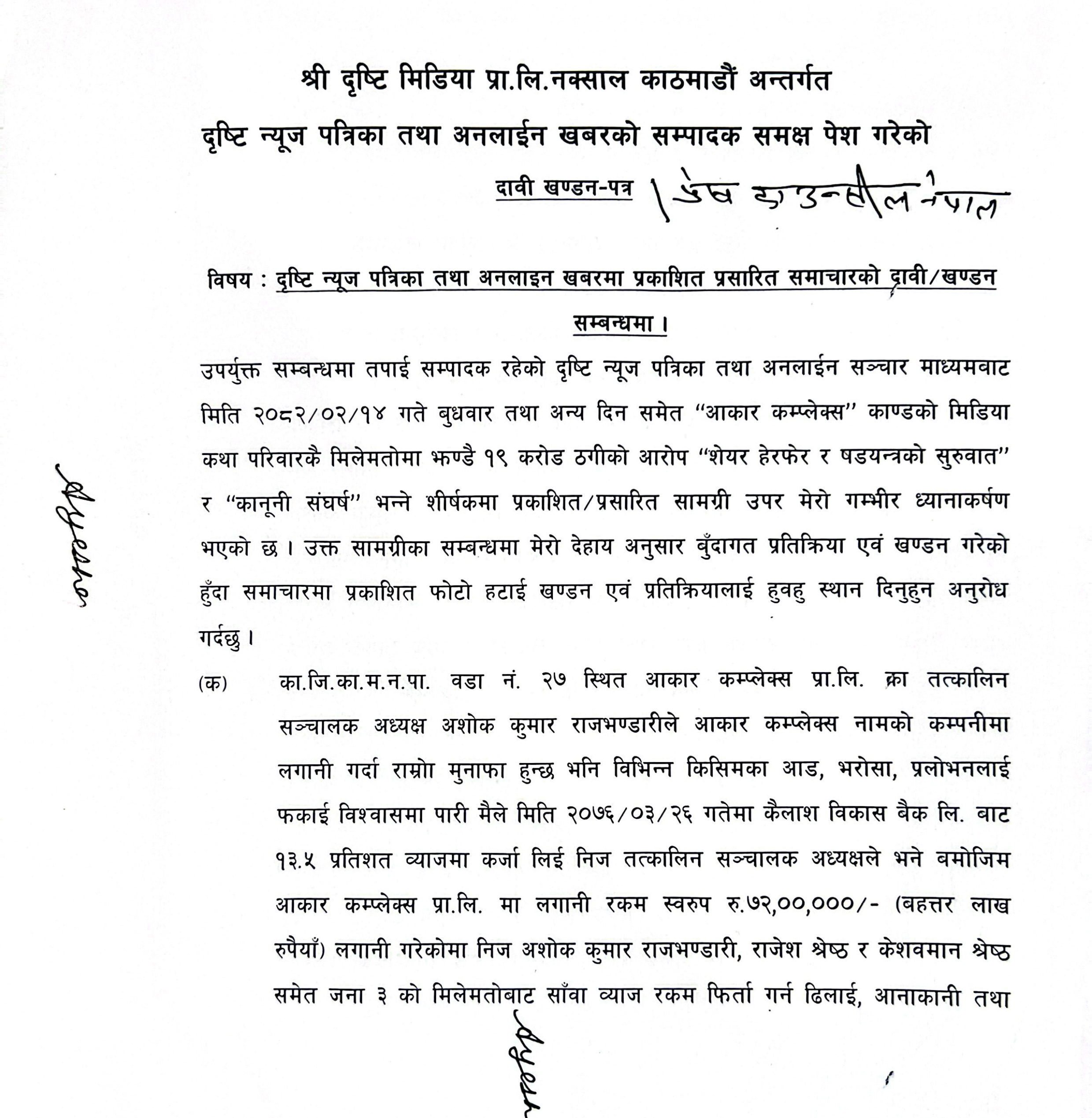 माथि सम्प्रेषित सामग्रीप्रति आनन्द प्रकाश राजभण्डारीले असहमति जनाउँदै खण्डन गरेका छन् । २०८२ जेठ १४ गते बुधबार प्रकाशित यस समाचार तथ्यहिन र भ्रामक भएको र यसले आफ्नो प्रतिष्ठामाथि आँच पु-याएकाले भन्दै खण्डन गर्न अनुरोध गरेअनुसार आनन्द प्रकाश राजभण्डारीबाट प्राप्त खण्डन यहाँ जस्ताको तस्तै प्रकाशित गरिएको छ । प्रेस काउन्सिल नेपाललाई बोद्धार्थ गरी राजभण्डारीबाट प्रेषित खण्डन आज मिति २०८२ असार ११ गते प्रकाशित गरेका छौँ । साथै, निवेदक राजभण्डारी को अनुरोधमा व्यक्तिको तस्बिरसमेत हटाएर कम्लेक्सको फोटो राखिएको जानकारी गराउँदछौँ । -सम्पादक