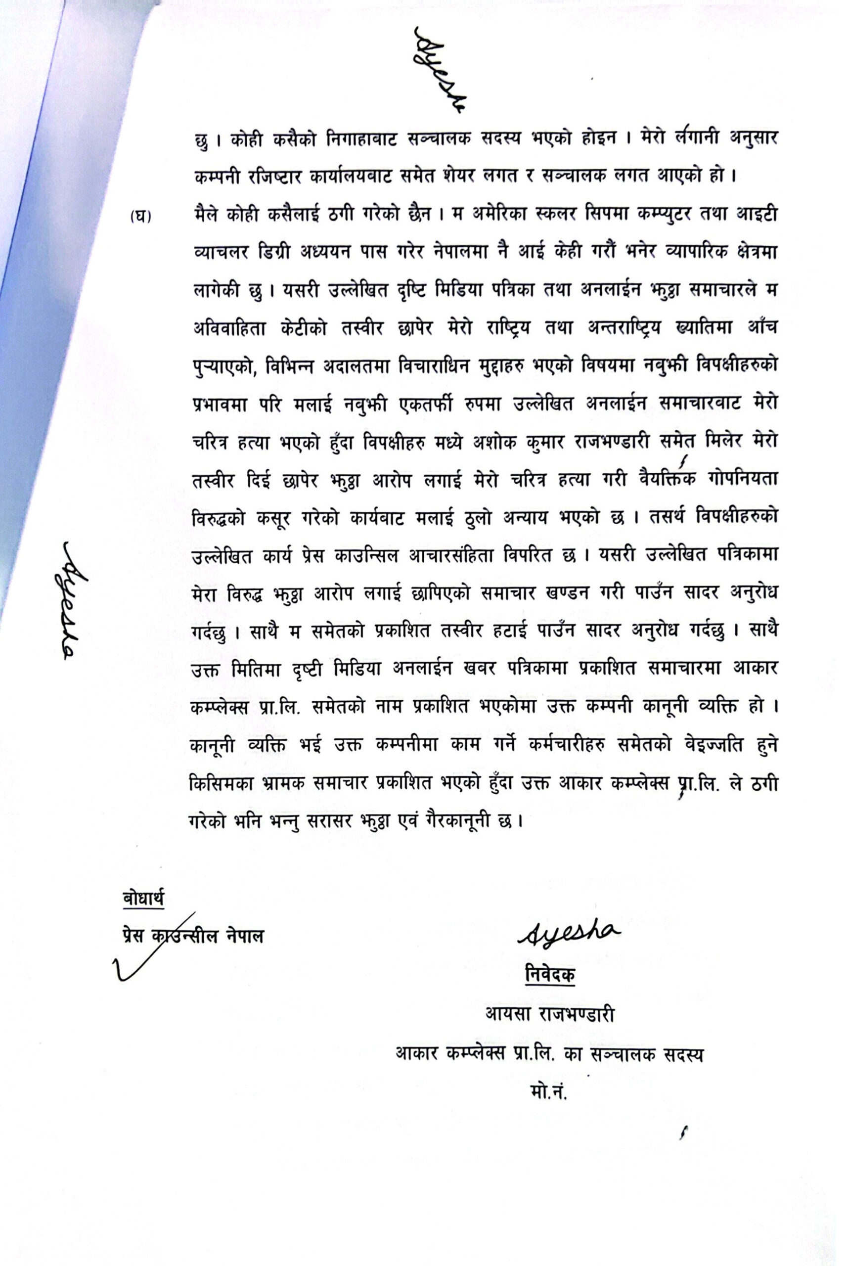 यस्तै, उल्लेखित समाचारप्रति आयसा राजभण्डारी पनि असहमति जनाएकी छन् । आयसाले आफुले कसैलाई नठगेको समेत प्रष्ट पारेकी छन् । प्रेस काउन्सिलाई बोद्धार्थ आयसाले खण्डन पत्रमा भनेकी छन्, ‘म कसैको निगाहबाट सञ्चालक सदस्य भएको होइन, मेरो लगानी अनुसार कम्पनी रजिष्टार कार्यालयबाट समेत शेयर लागत र सञ्चालक लागत आएको हो ।’ प्रकाशित समाचार झुटो र तथ्यहिन उल्लेख गर्दै आयसाले यस समाचारले आफ्नो मान प्रतिष्ठामा आँच पुगेकाले खण्डन प्रकाशित गर्न अनुरोध गरेअनुसार यो खण्डन आज मिति २०८२ असार ११ गते प्रकाशित गरिएको छ ।