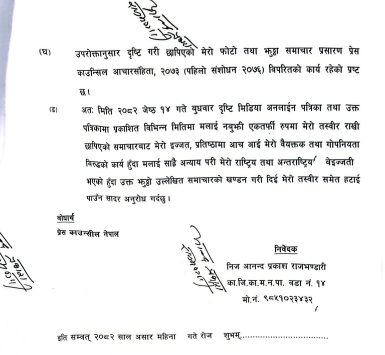 प्रेस काउन्सिल नेपाललाई बोद्धार्थ आकाश राजभण्डारीद्वारा प्रेषित खण्डन २०८२ असार १२ गते प्राप्त भएको र असार १४ गते जस्ताको तस्तै यहाँ प्रकाशित गरिएको छ । –सम्पादक