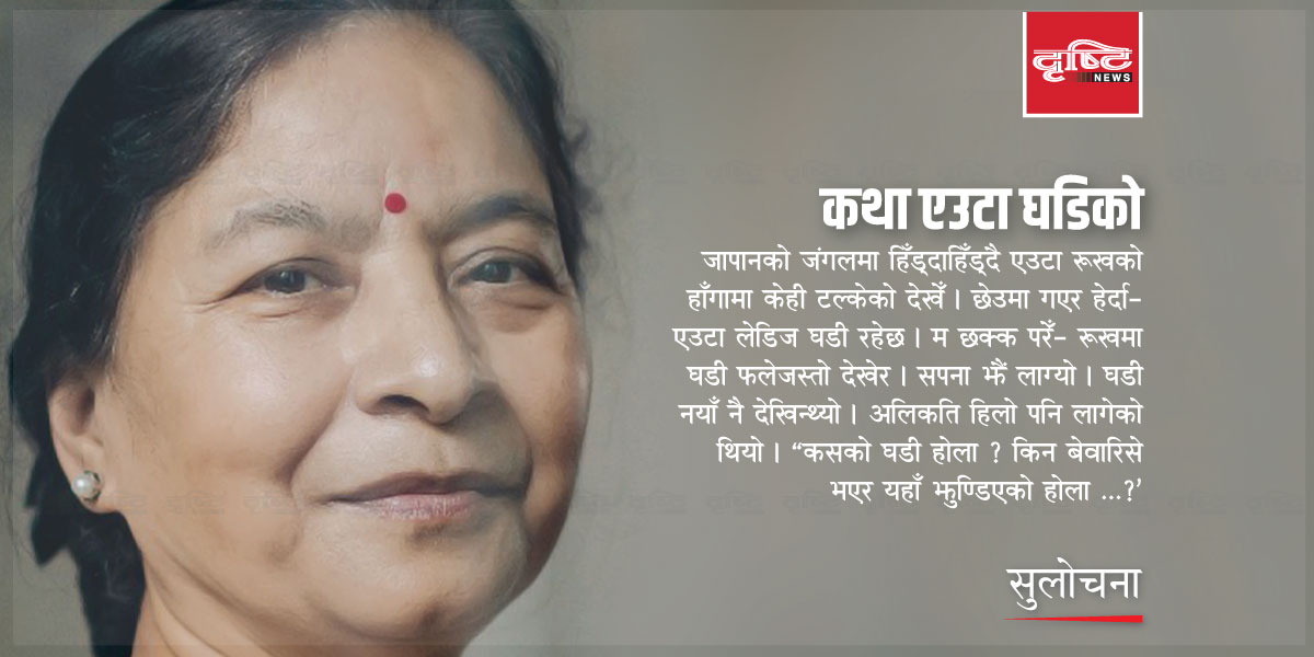 जापान पुगेपछि घडी किन्छु भन्ने सोँचेकी थिएँ । तर महङ्गो लागेकोले फर्किने बेलासम्म पैसा बचेछ भने किनुँला भनेर पर्खेकी थिएँ । पुरानो घडी छोरीलाई नेपाल फर्किने बेला लगाइदिएकी थिएँ । आवश्यक परिहाले हेरुँला भनेर बुढाको घडी ब्यागमा बोकेकी थिएँ । सपनामा पनि घडी किनेको देखेकी थिएँ, घडीको आवश्यकता सम्झेर होला । तर यसरी जङ्गलमा यो महिला घडी नै भेट्नु एउटा अचम्मको संयोग थियो । यस्तो किन हुन्छ ? बुझ्न सकिरहेकी थिइनँ ।