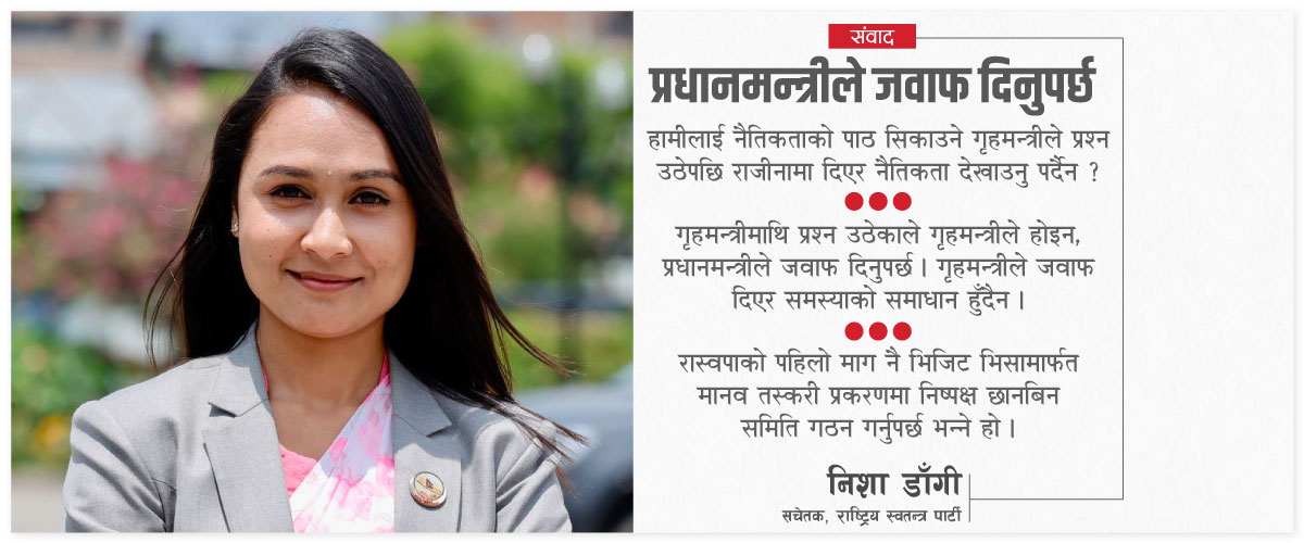 त्यति मात्रै होइन, कांग्रेसकै वरिष्ठ नेता डा. शेखर कोइराला, महामन्त्री गगन थापासहितका सांसदहरूले समेत गृहमन्त्री लेखकको राजीनामा मागेका छन् । चौतर्फी रुपमा नैतिक प्रश्न खडा हुँदासमेत गृहमन्त्री लेखक लाज पचाएर पदमा बसिरहेका छन् । भिजिट भिसाको नाममा मानव तस्करीजस्तो गम्भीर आरोप सामान्य विषय होइन । यिनै विषयमा राष्ट्रिय स्वतन्त्र पार्टीकी सचेतक निशा डाँगीसँग दृष्टिले गरेको कुराकानीको सम्पादित अंशः