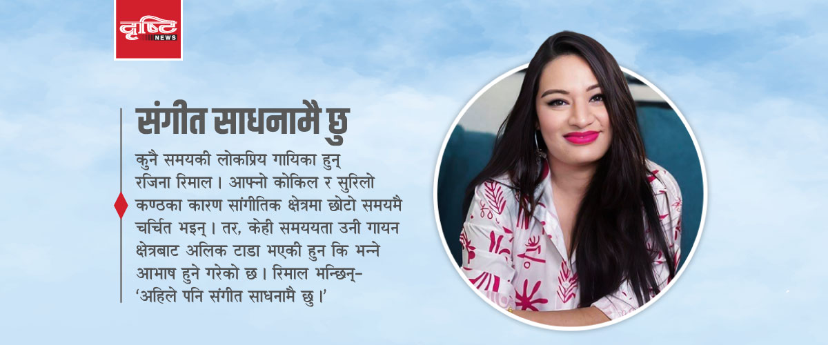 कुनै समयकी लोकप्रिय गायिका हुन् रजिना रिमाल । आफ्नो कोकिल र सुरिलो कण्ठका कारण उनी सांगीतिक क्षेत्रमा छोटो समयमै चर्चित भइन् । ११ वर्षकै उमेरमा ‘परी’ नामक एल्बम निकालेर सांगीतिक यात्रा प्रारम्भ गरेकी रिमालले एकपछि अर्को लोकप्रिय गीत पस्कँदै गइन् । उनले सात हजारभन्दा बढी गीत गाइसकेकी छिन् । आधुनिक मात्र नभएर पाश्र्वगायनमा पनि उनी उत्तिकै अब्बल हुँदै चम्किइन् । तर, केही समययता उनी गायन क्षेत्रबाट अलिक टाडा भएकी हुन कि भन्ने श्रोता–दर्शकले आभाष गरेका छन् । पारिवारिक तथा विविध कारण हुन सक्छ, साँच्ची उनी पहिलेजस्तो गायनमा सक्रिय छैनन् । यद्दपि, विवाहपछि ओझेलमा परेकी रिमाल भन्छिन्, ‘अहिले पनि संगीत साधनामै छु ।’ यिनै गायिका रजिना रिमालसँग रेजिना पाण्डेको जम्काभेट ः