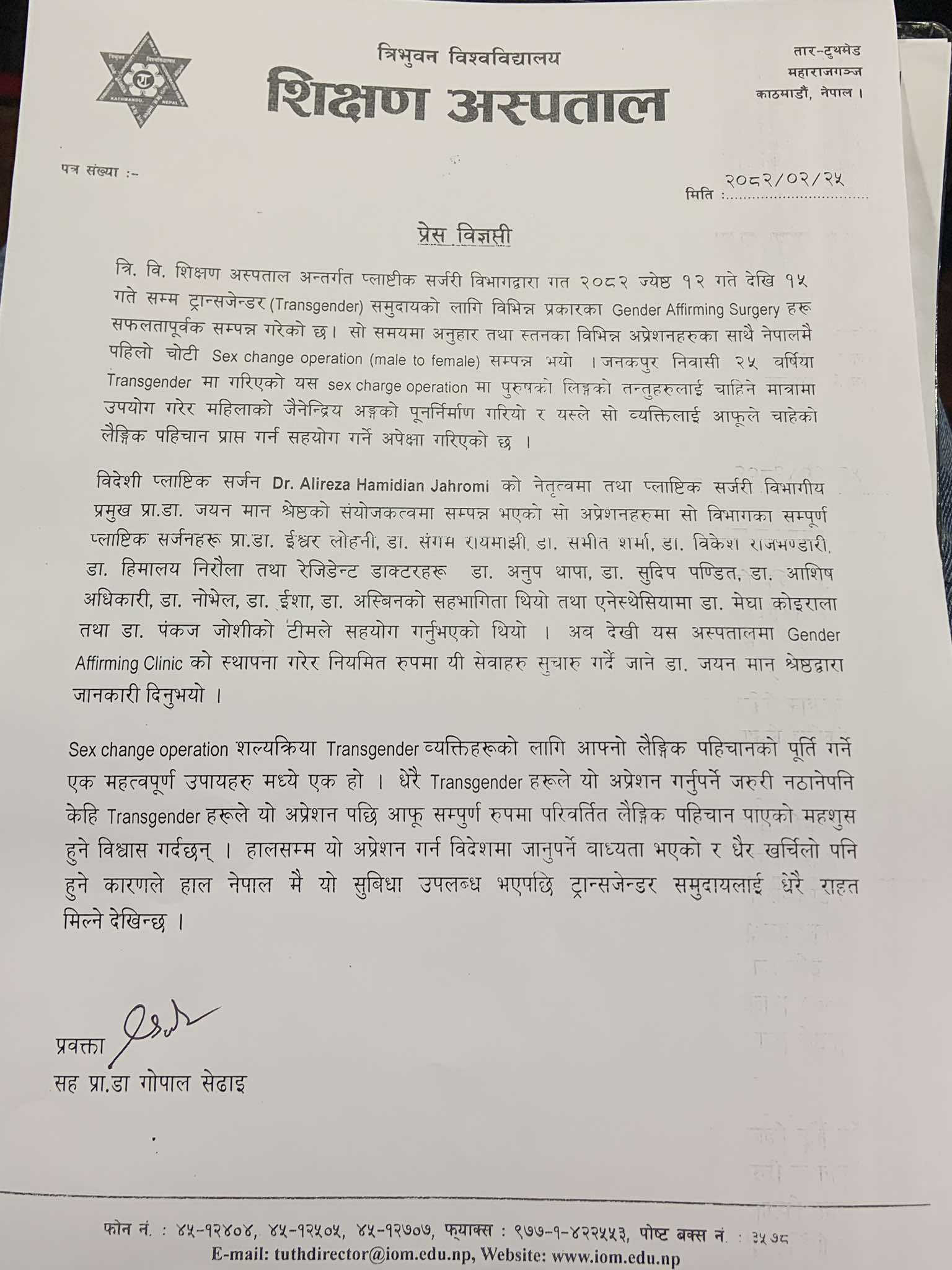 र यसले सो व्यक्तिलाई आफूले चाहेको लैंगिक पहिचान प्राप्त गर्न सहयोग गर्ने अपेक्षा गरिएको अस्पतालका प्रवक्ता सह प्रा.डा गोपाल सेढाईले विज्ञप्तिमा उल्लेख गरेका छन् ।