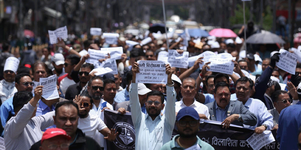 काठमाडौं । सरकारले आर्थिक वर्ष २०८२/८३ को बजेटमा सुनचाँदीमा २ प्रतिशत र हिरा, जुवाहरत तथा पत्थरमा १३ प्रतिशत विलासिता कर लगाउने घोषणापछि व्यवसायीहरूले कर खारेजीको माग राख्दै काठमाडौंमा शान्तिपूर्ण प्रदर्शन गरेका छन् ।