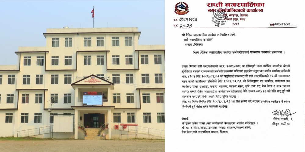 काठमाडौं । चितवनको राप्ति नगरपालिकाले एकैपटक ७४ जना कर्मचारी हटाएको छ ।