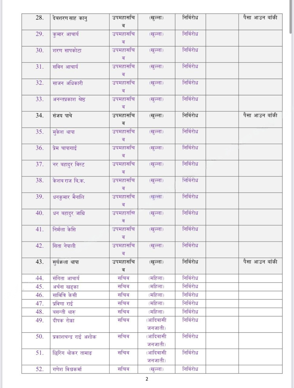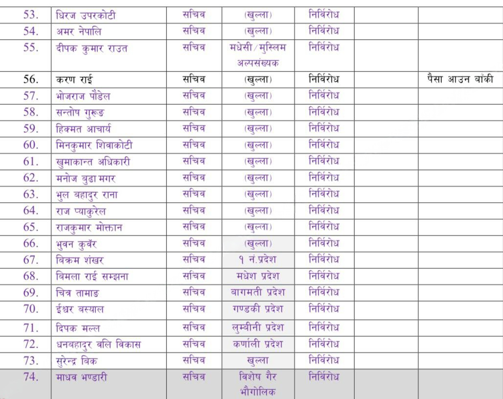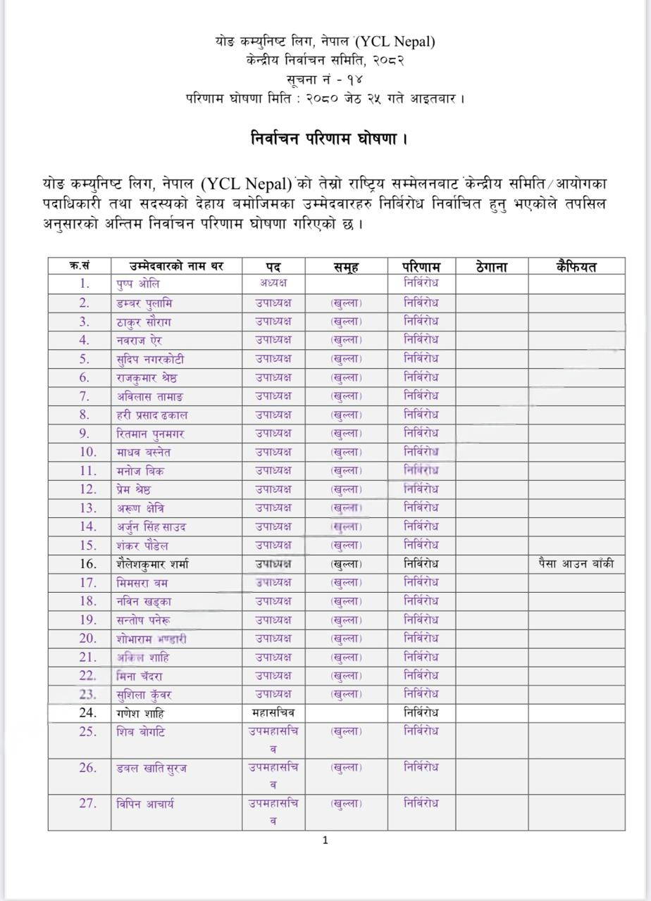यस्तै महासचिवमा गणेश शाही चयन भएका छन् । उपमहासचिव १९ र सचिव ३१ जना चयन भएका छन् । आकांक्षीहरु धेरै भएपछि सर्वसम्मत नेतृत्व चयन गर्नको लागि वाइसिएलले पदाधिकारीको संख्या बढाएको हो ।